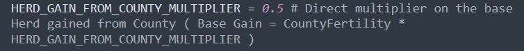Every month, your Herd will increase based on the Herd Gain from your domain as well as contributions from Vassals and Tributaries. The Herd you gain from your Domain is equal to the current County Fertility of that County multiplied by the define HERD_GAIN_FROM_COUNTY_MULTIPLIER