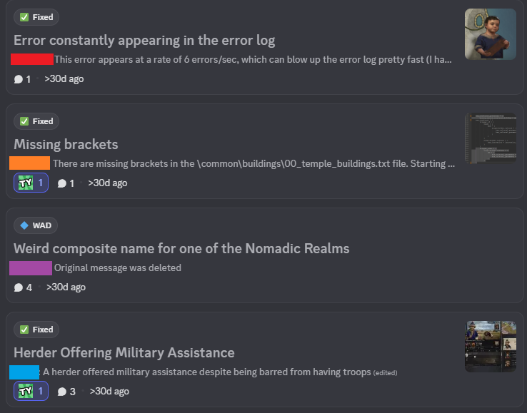 Finally, in the last month or so before releasing Khans of the Steppe, we ran a separate preview group to get a final round of feedback. This is essentially a time-limited version of our persistent beta, and has a similar selection criteria for participation. During this stage, we essentially throw the flood gates open and pull in as many people as we think we can manage while maintaining some semblance of operational security. Mod team representation increases dramatically during this stage in order to give them a head start on compatibility patching their mods, and any content creator too slow to outrun our Influencer Relations Manager is also pulled into this time-limited program. Before you ask: Yes, that youtuber you’re thinking of is in this program. Yes, that one is too. Yes, them as well.