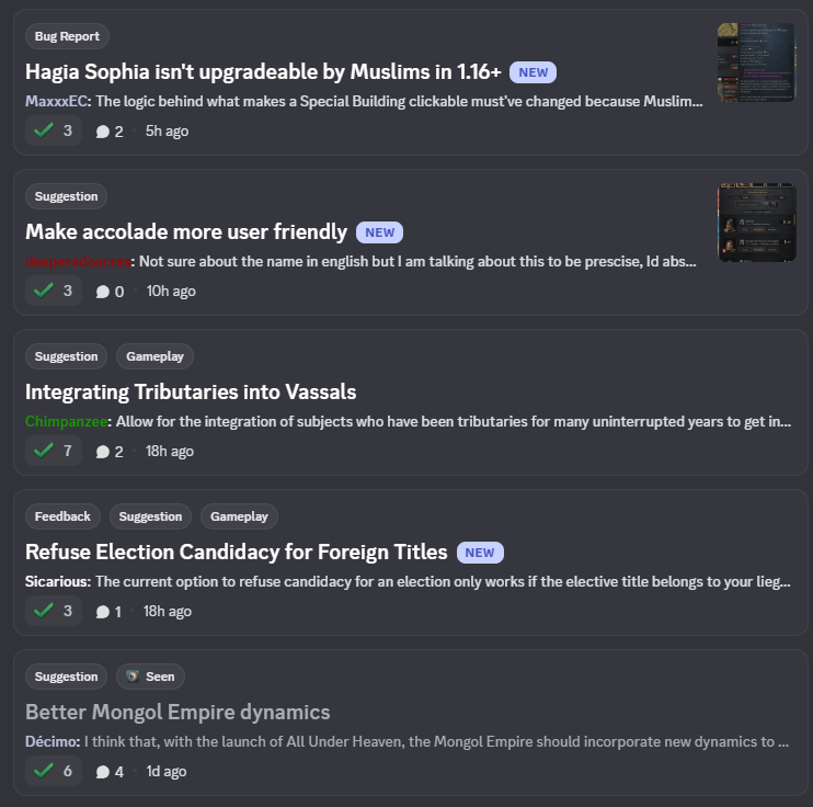 [The pc-feedback channel on our official Discord server is one of several “primary” feedback channels we use. Voting systems make it easier to tell at a glance which posts are more important to the community there. Sadly, Reddit votes aren’t as useful for this purpose.]