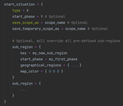 Ending - A Situation ends automatically when a phase (in any sub-region) ends without a new phase starting. Additionally, they can be ended in script via an ‘end_situation’ effect.