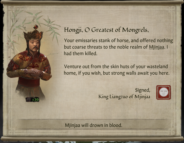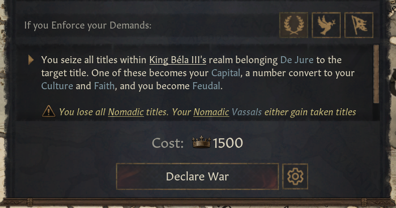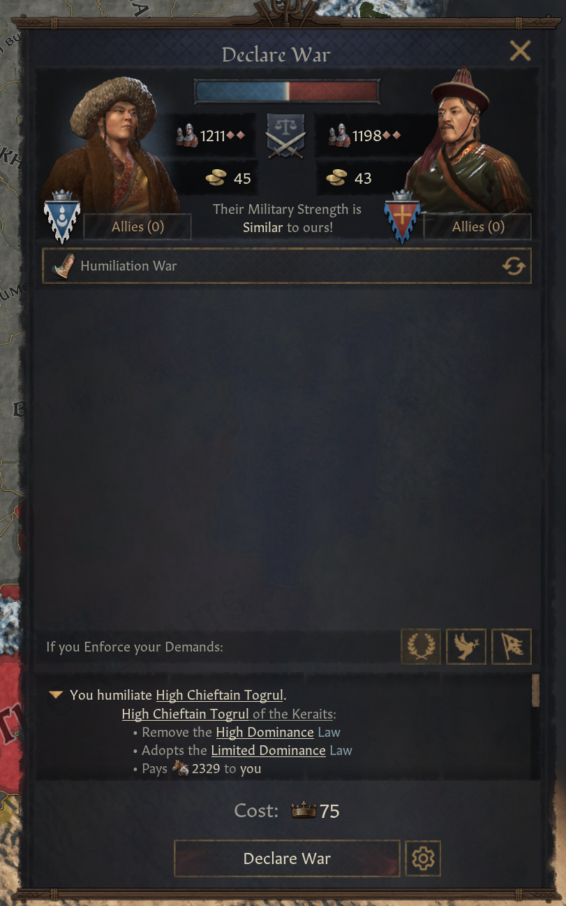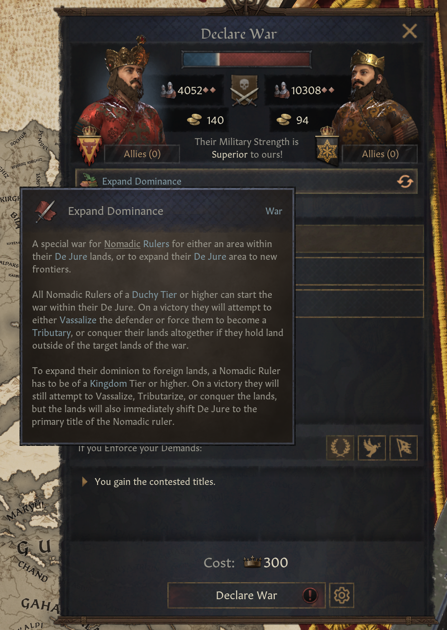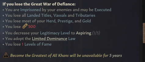 When you’re ready to face an uncertain number of foes in order to achieve your grand destiny… click the button. The Great War of Defiance begins, and every nearby ruler in the steppe joins against you. At least one powerful non-nomad will join as well, since - like historical Byzantium and China - they certainly have no interest in a great steppe conqueror arising.