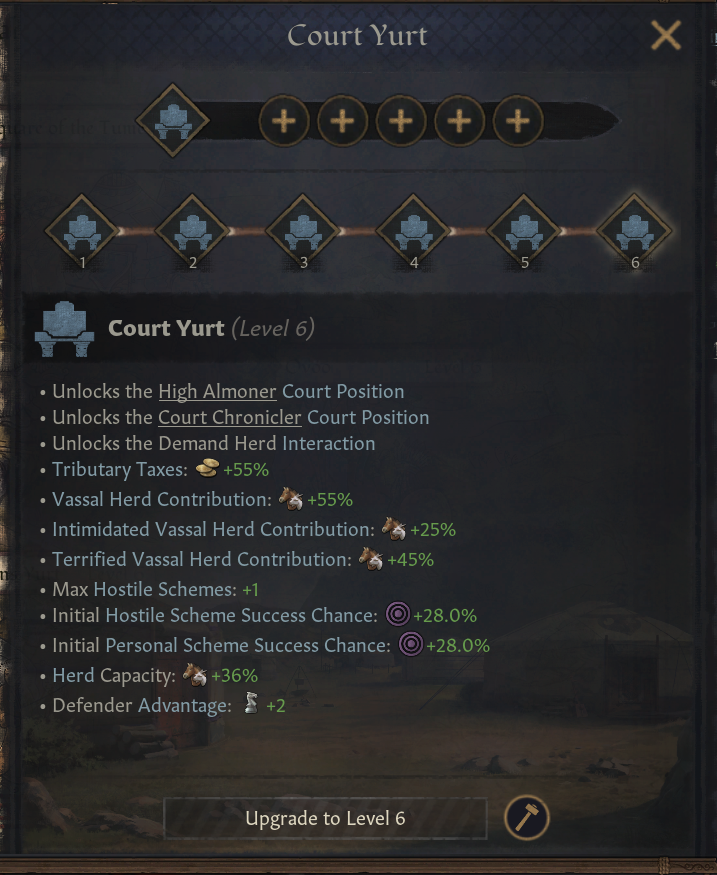 If you wish to rely on sellswords, this yurt has you covered. The modifier gives you martial, prowess, and stewardship skills and is available only on the 6th level of this yurt.
