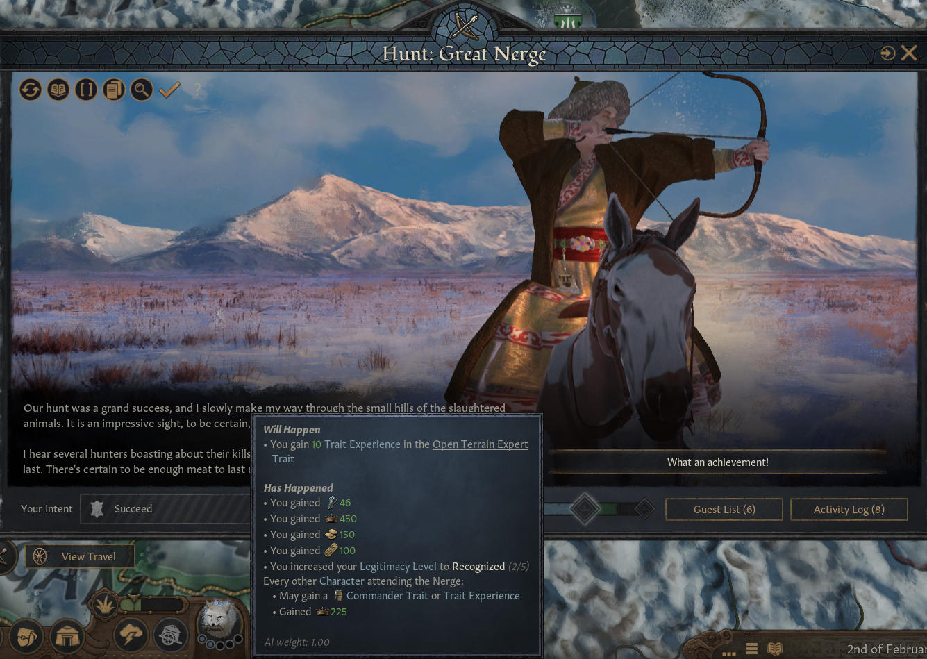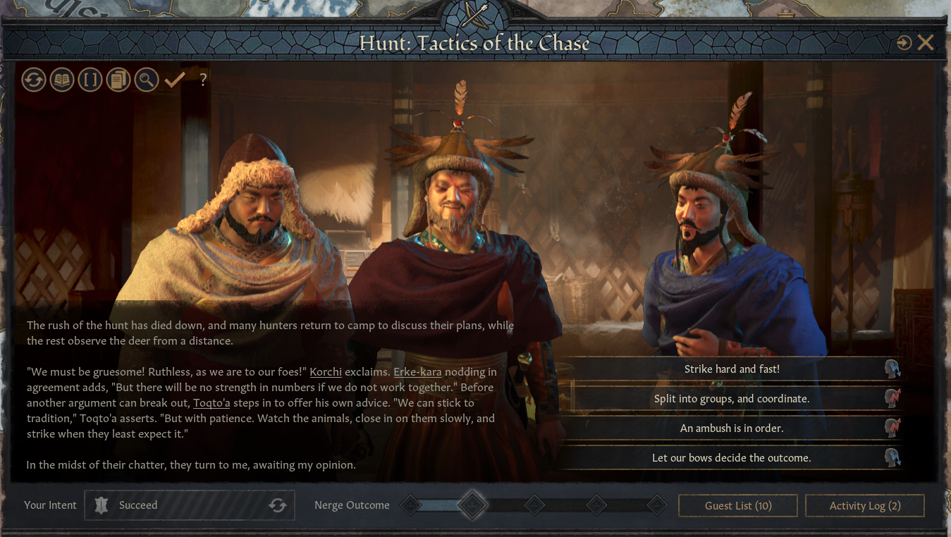 The third is the Yurtchi, a position similar to a quartermaster that oversees both your camp and your troops. It has access to two tasks, either decreasing everyone’s opinion of you and costing a lot of prestige but gaining more gold, or spending gold to increase everyone’s opinions of you and popular opinion.