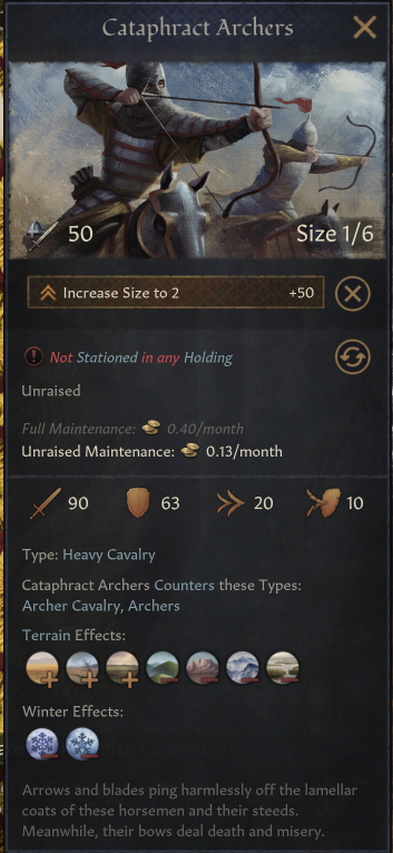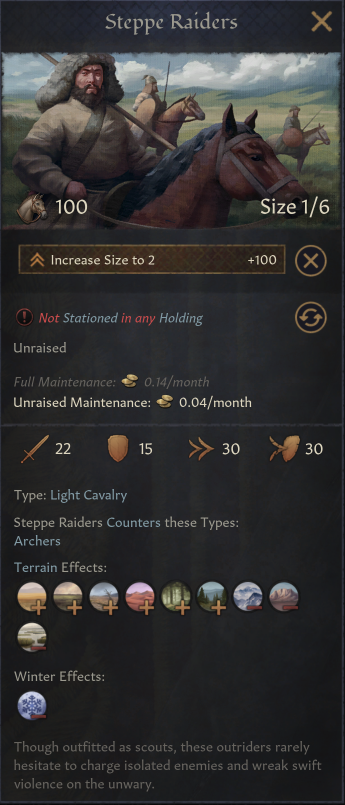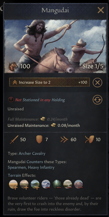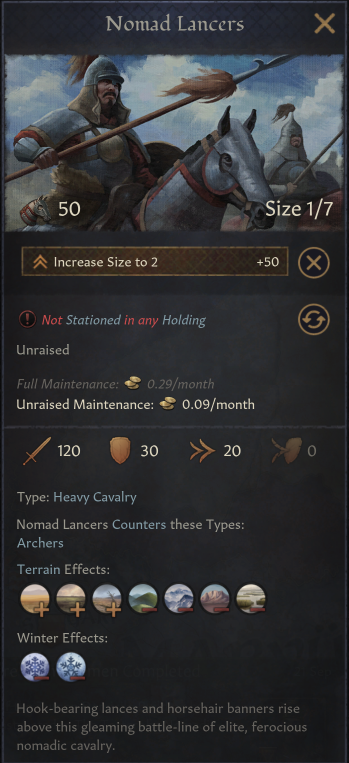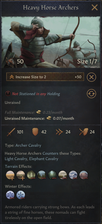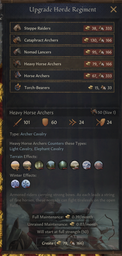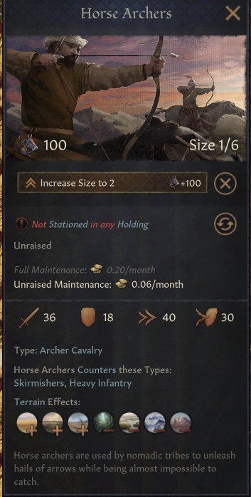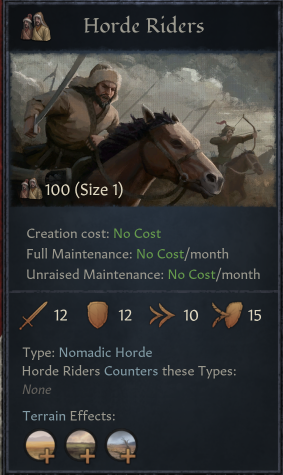 Horde Riders are the most basic type of Men-at-Arms that Nomads have access to. However, these Riders can be then upgraded to better MAAs types, such as Horse Archers, for a cost of gold. These numbers don't come from a vacuum, however; if I want to create 100 Horse Archers, then I will lose 100 Horde Riders as they are converted into the new unit.