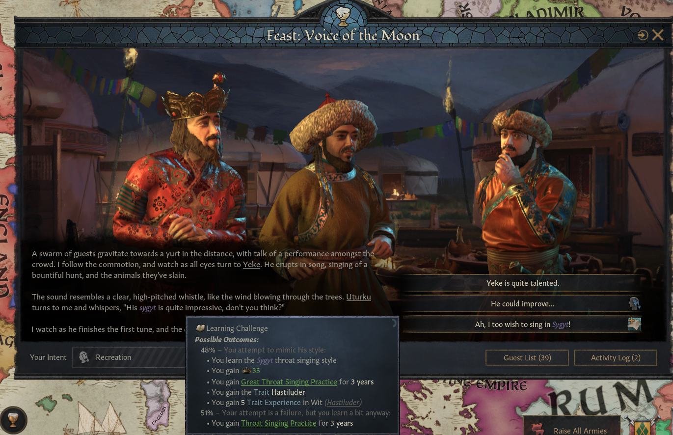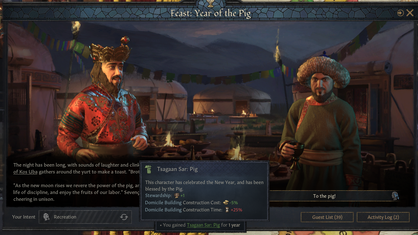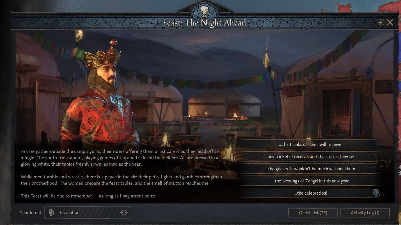 Lastly, we are adding a number of new Character Interactions, Decisions, Activity Types, a new Vassal Stance, Events, and more focused on unique Nomadic flavour. Genghis Khan's famous storyline and Mongolian specific events will, of course, also make an appearance.