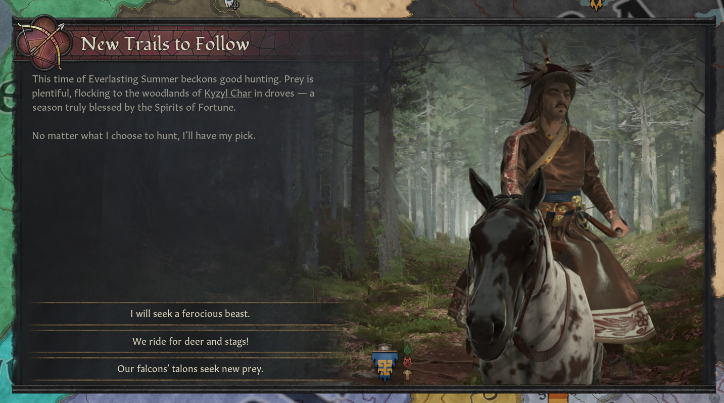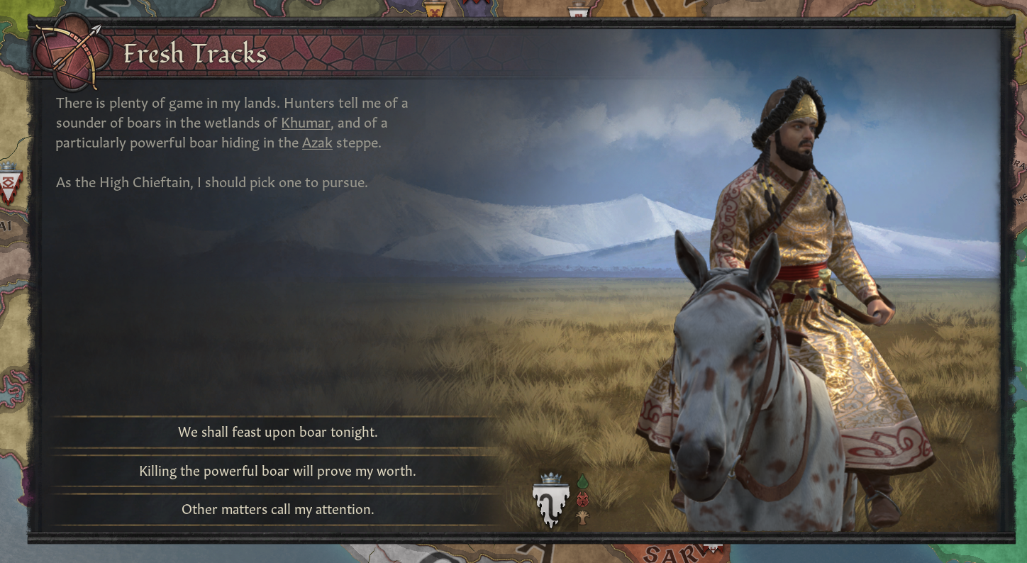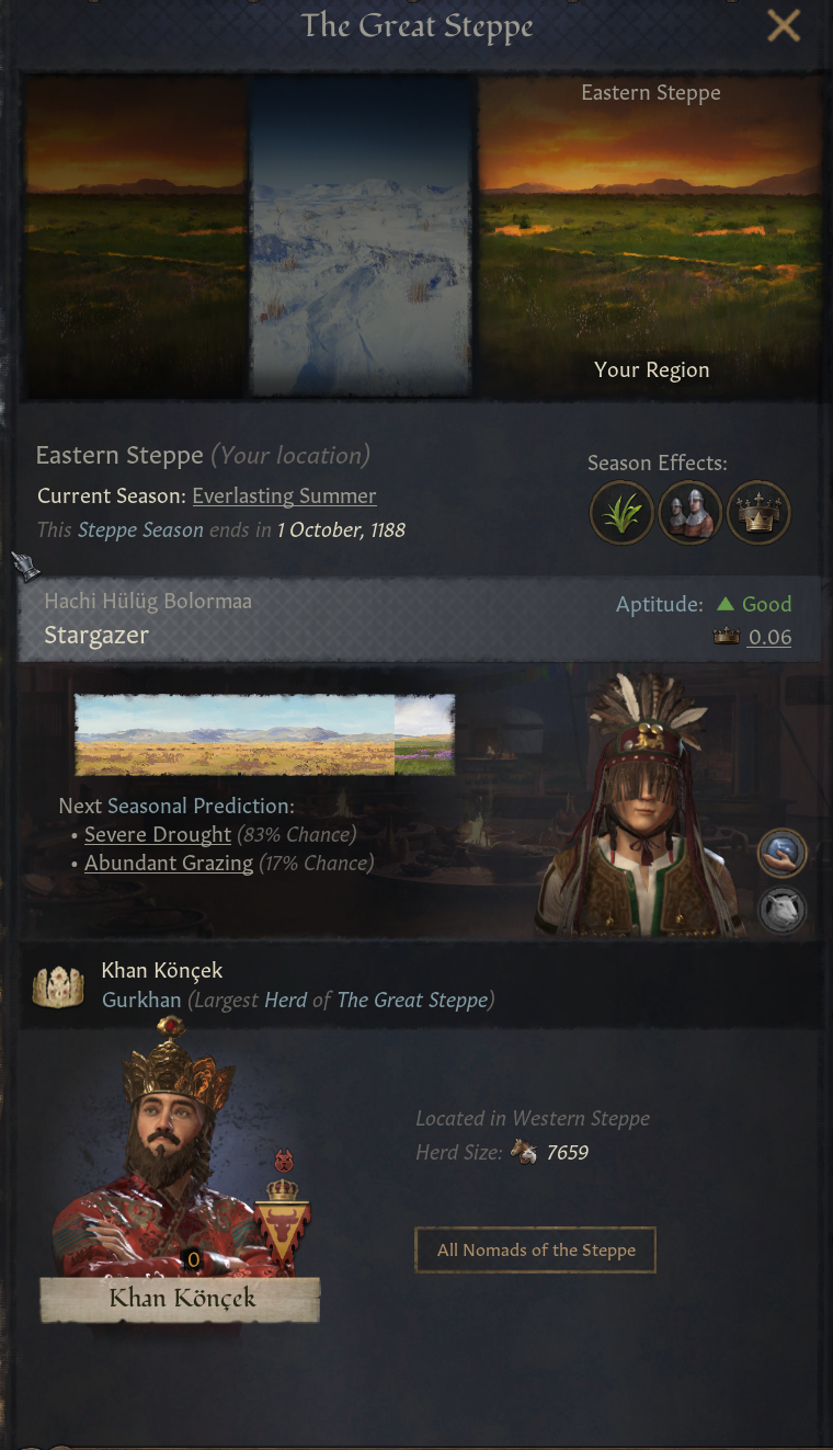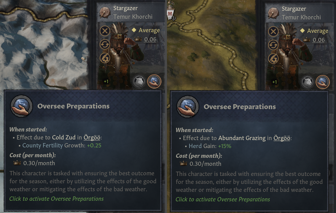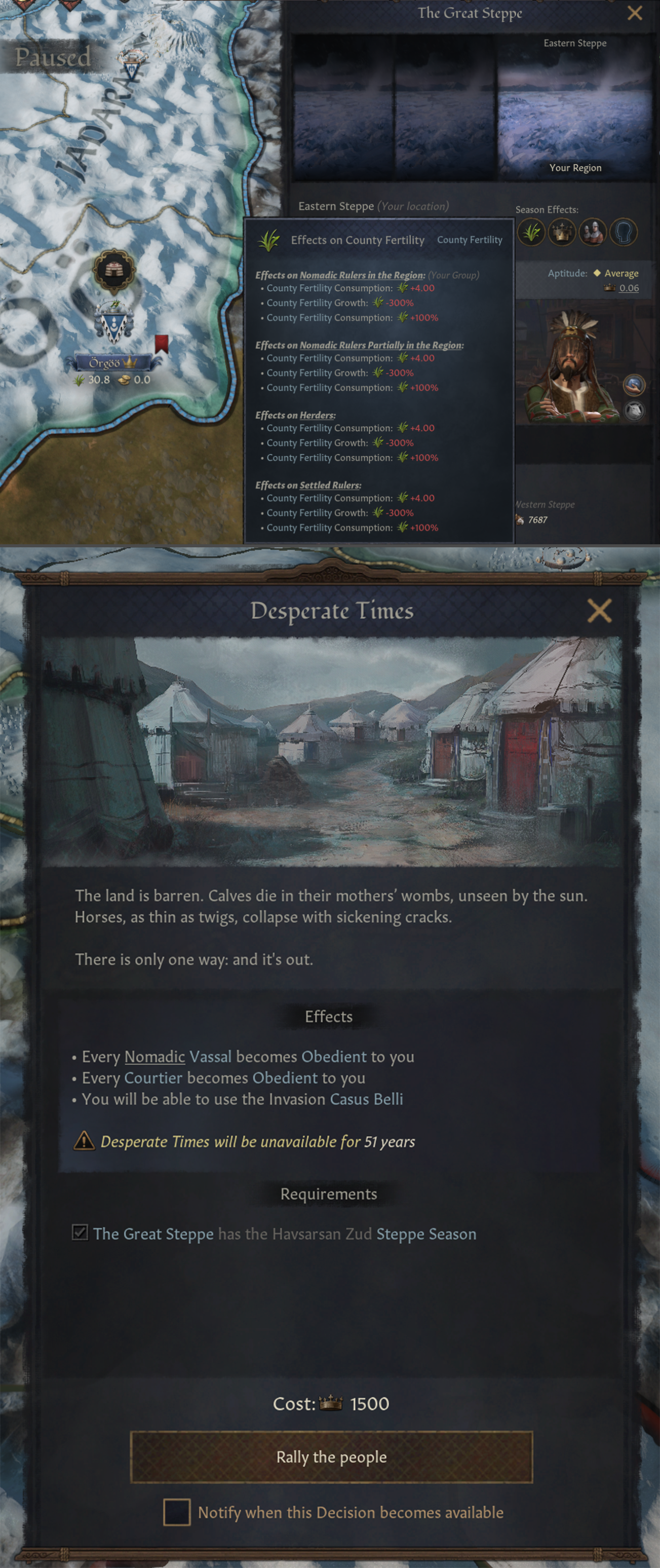 The two special and rare seasons of Havsarsan Zud and the Blessing of the Blue Sky explore these effects even further, with the Blessing amply increasing the Fertility of the subregion and the terrible Havsarsan Zud allowing rulers to take a desperate stance, making all of their subjects obedient and getting an invasion CB on settled people. One of the academic reasons given for the Mongolian Invasion is, after all, the lack of pasture in the Steppe at that point in time.
