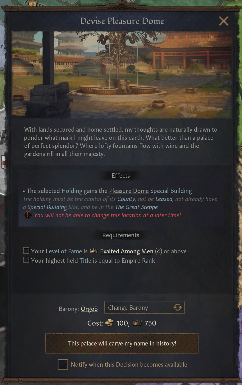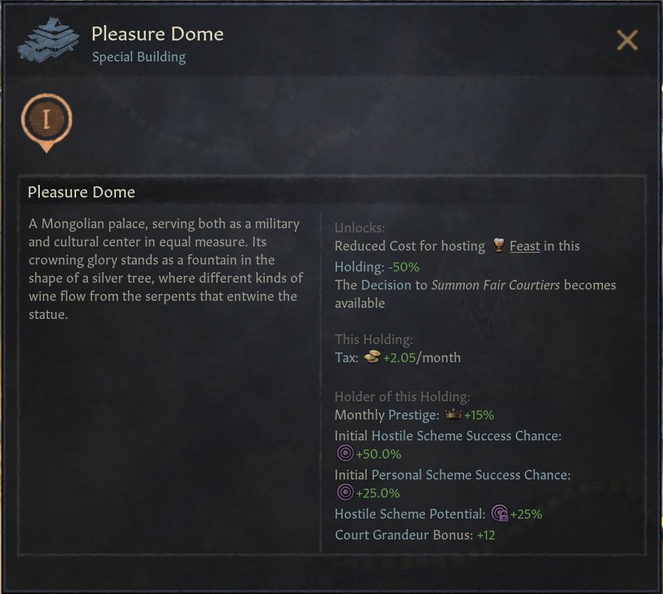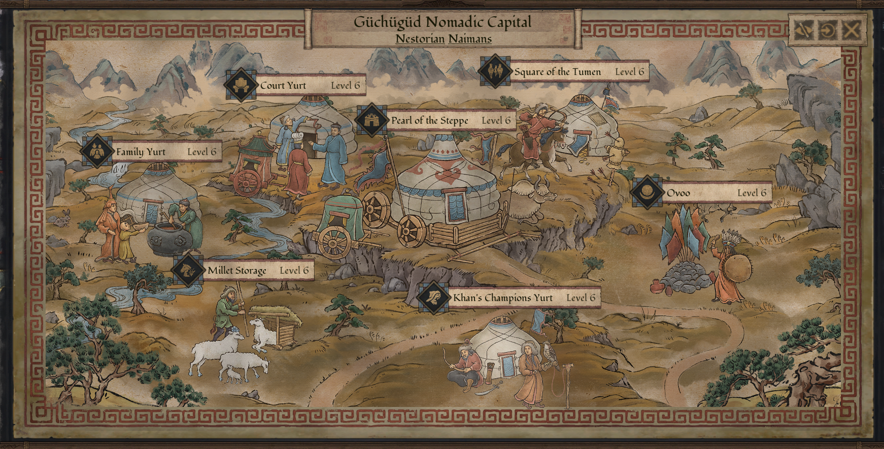 As one of the most trusted Temujin advisors allegedly once said, conquering the world on horseback is easy; it is dismounting and governing that is hard. For when your glorious horde has swept the steppe, the Court Yurt will provide you with more tools to deal with your trusted subordinates and newfound subjects.