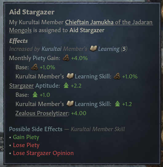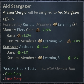 If you want to maximize the potential of your Stargazer and their predictions, having a well-taught Kurultai member who can help them out will be key to improving their Aptitude.