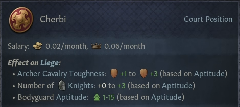 As the chief of the bodyguards, the Cherbi will improve other bodyguards, give access to more knights, and increase some of your Men-at-Arms. They can access the regular bodyguard task and a new task that improves your scheme defenses.