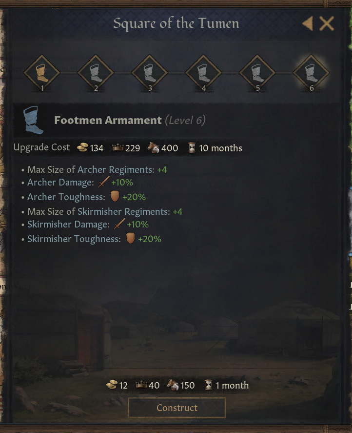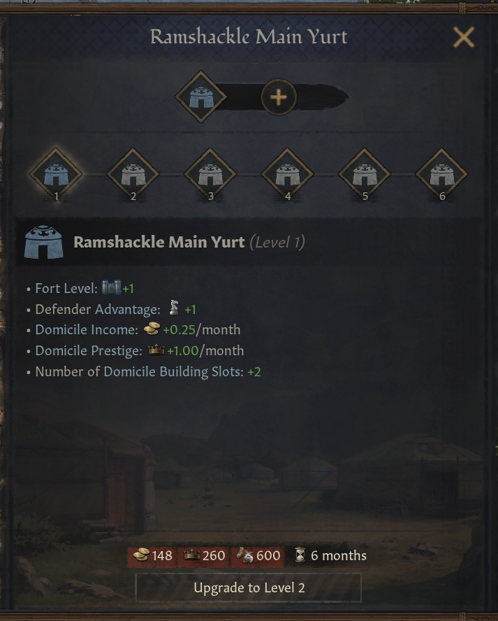 Yurts cost gold, prestige, and herd. While the costs are fairly low at the start, they get much higher with each upgrade. The steepest difference is in the gold cost. As gold income for the Nomads is much smaller than for the settled people, fully upgraded yurts require a lot of gold redistribution via raiding. So what can you get for your hard-earned wealth?