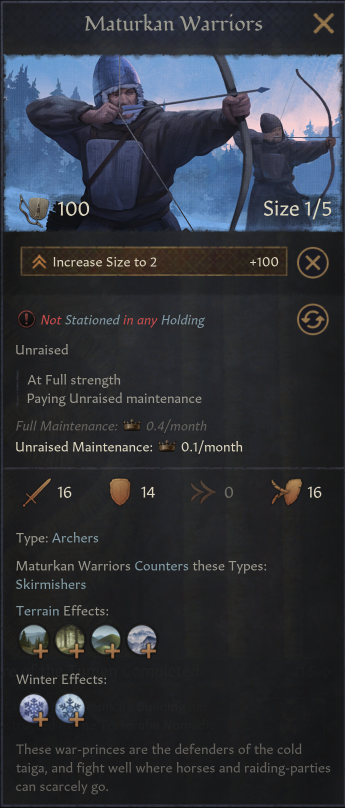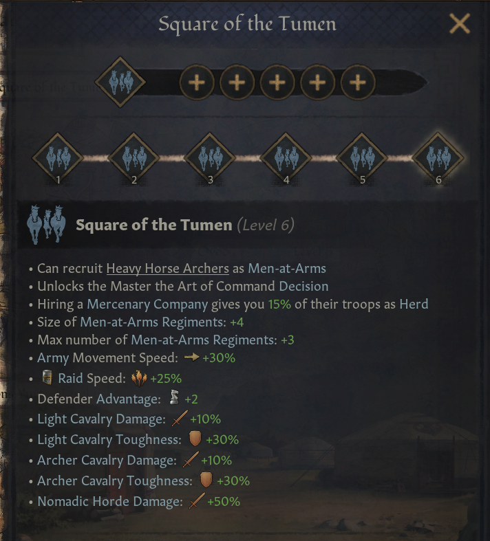 This yurt focuses heavily on warfare and raiding. If you're curious about the Heavy Horse Archers men at arms, please keep on reading or quickly scroll down to the Men-at-Arms section at the bottom.