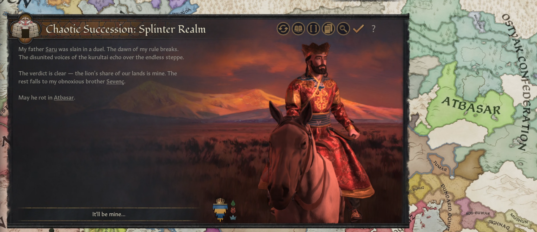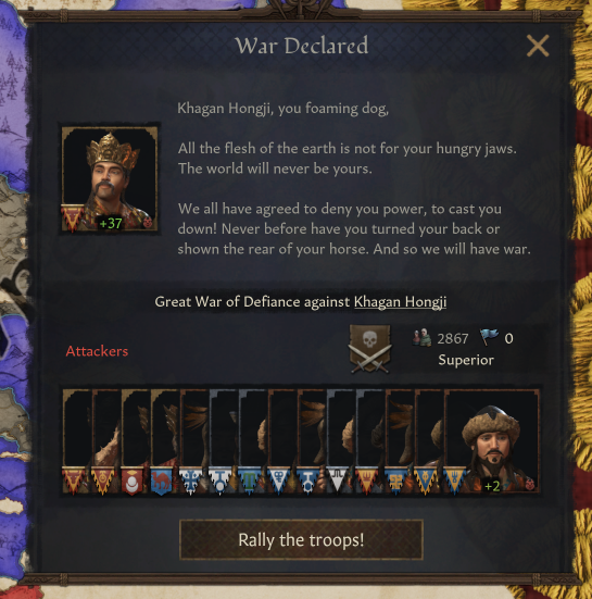 Though your Obedient vassals will join on your side, this should be a stiff fight! The coalition of rulers attack from all sides. If you’re a player trying to stop an AI Gurkhan who’s taken this decision: you’ll be given the chance to join the cause, and keep the Greatest of Khans available for yourself.