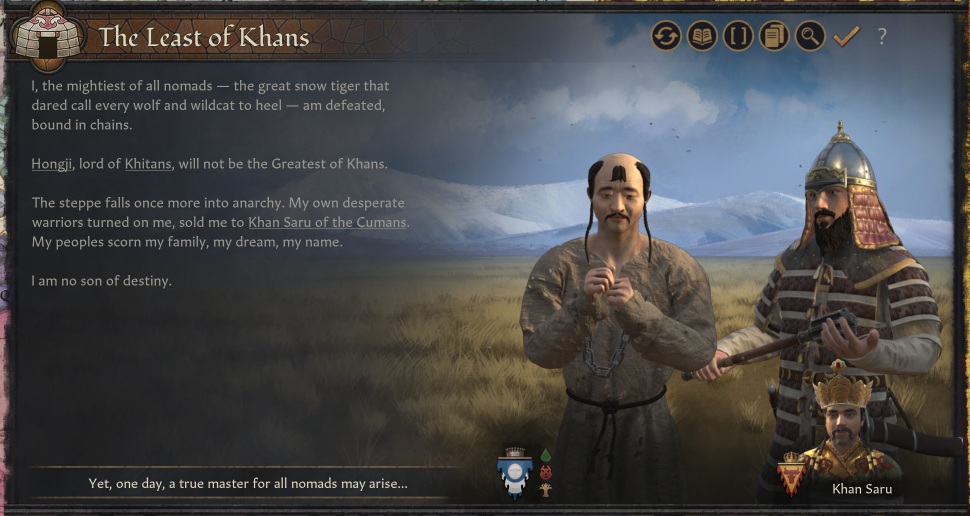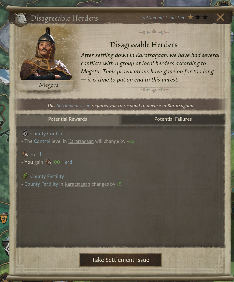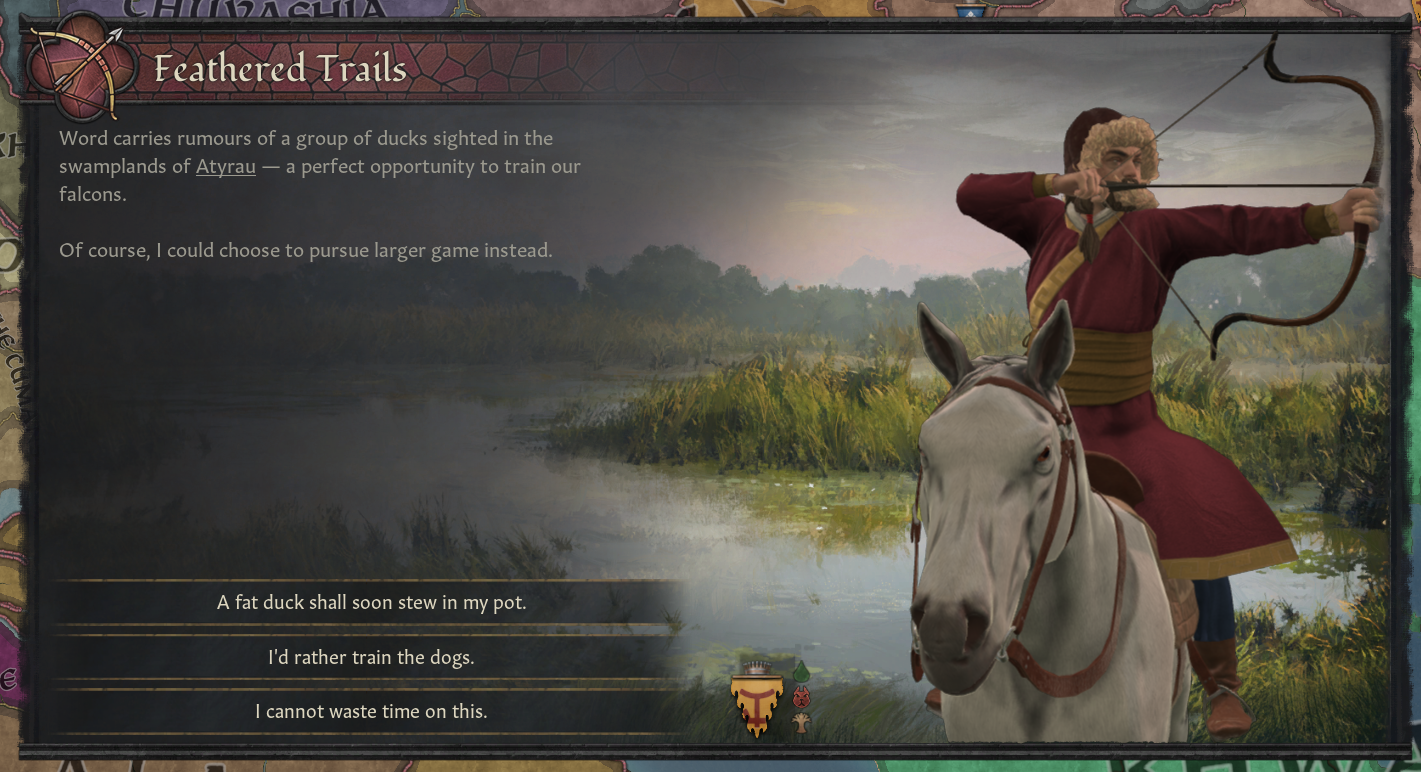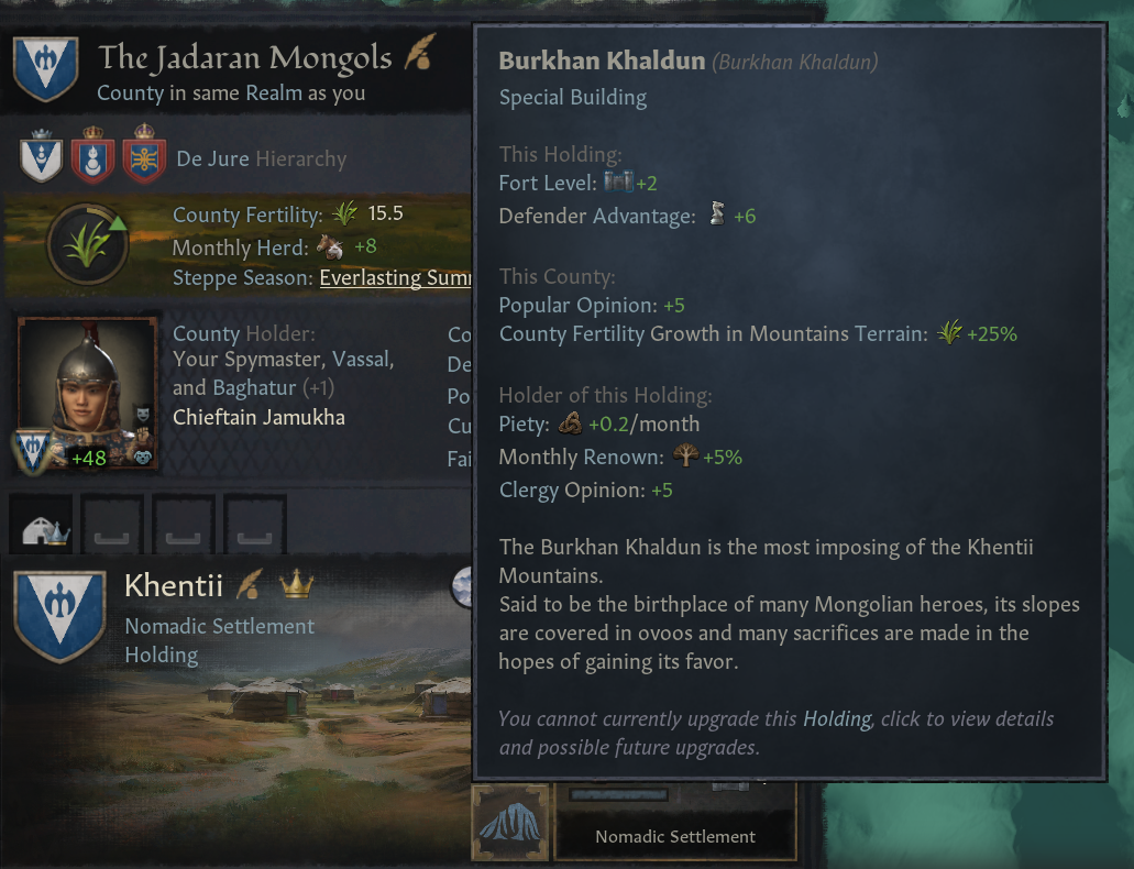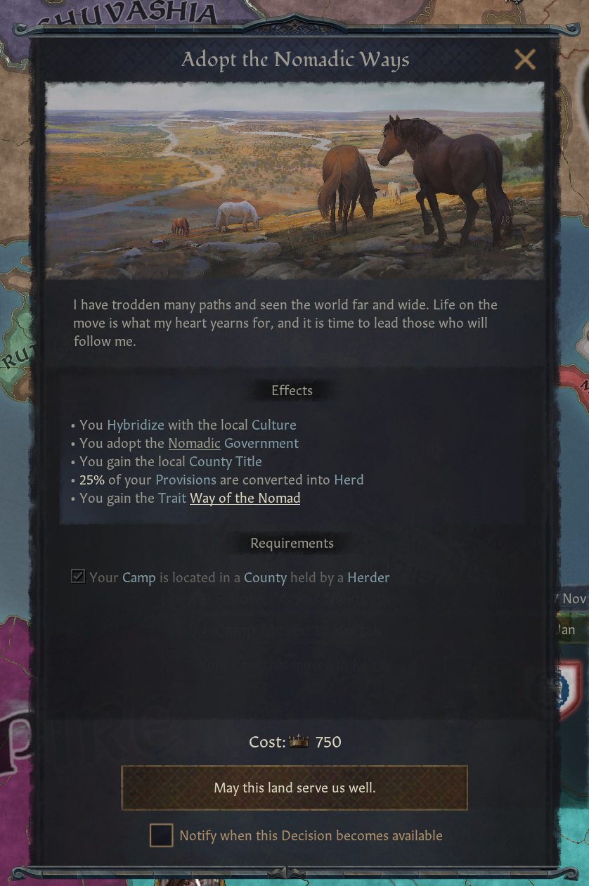 One may also choose to voluntarily abandon one of their counties to a local herder, in the hopes that they will replenish Fertility quick enough for them to seize it back. The Steppe is not merciful, however, and another Nomad ruler may be faster than you.