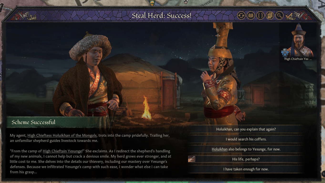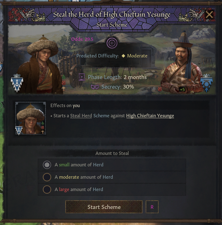 Your cattle and horses are represented by a new currency only available to Nomads called "Herd". In the Steppe, Herd is incredibly valuable and plays a big role in how other Nomads perceive you: it can be used for ransoming, dowry, bribes and even be stolen via a scheme or raiding. It controls who the Cultural Head is and serves as a gate for increasing Dominance (we will talk more about this later in this Diary).
