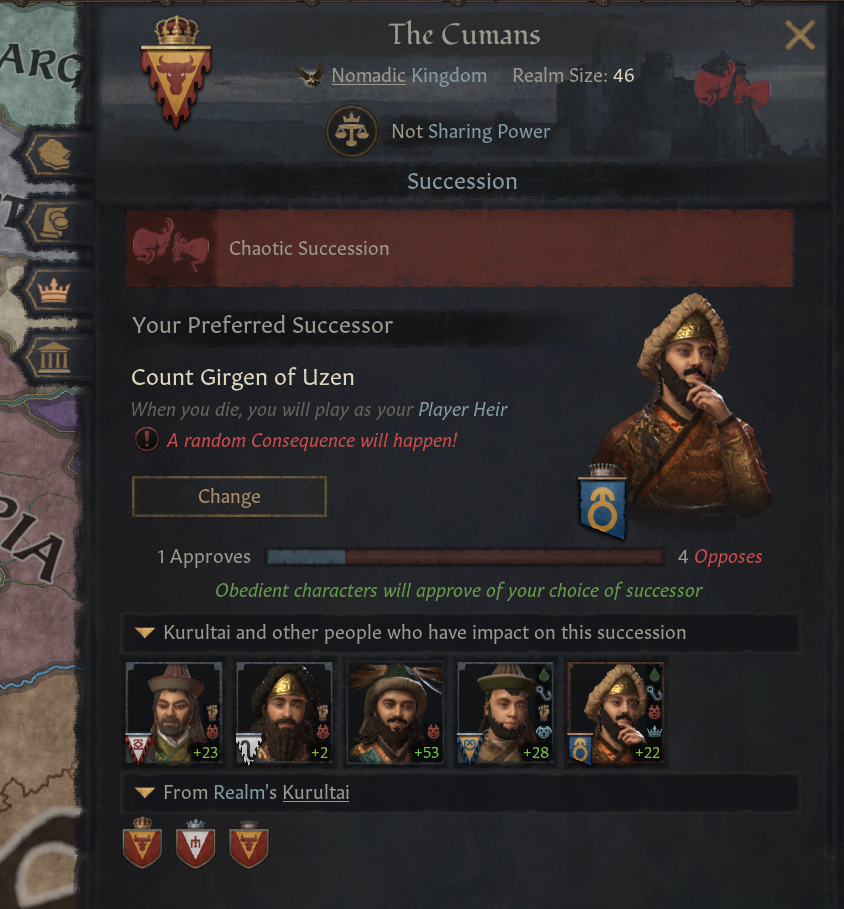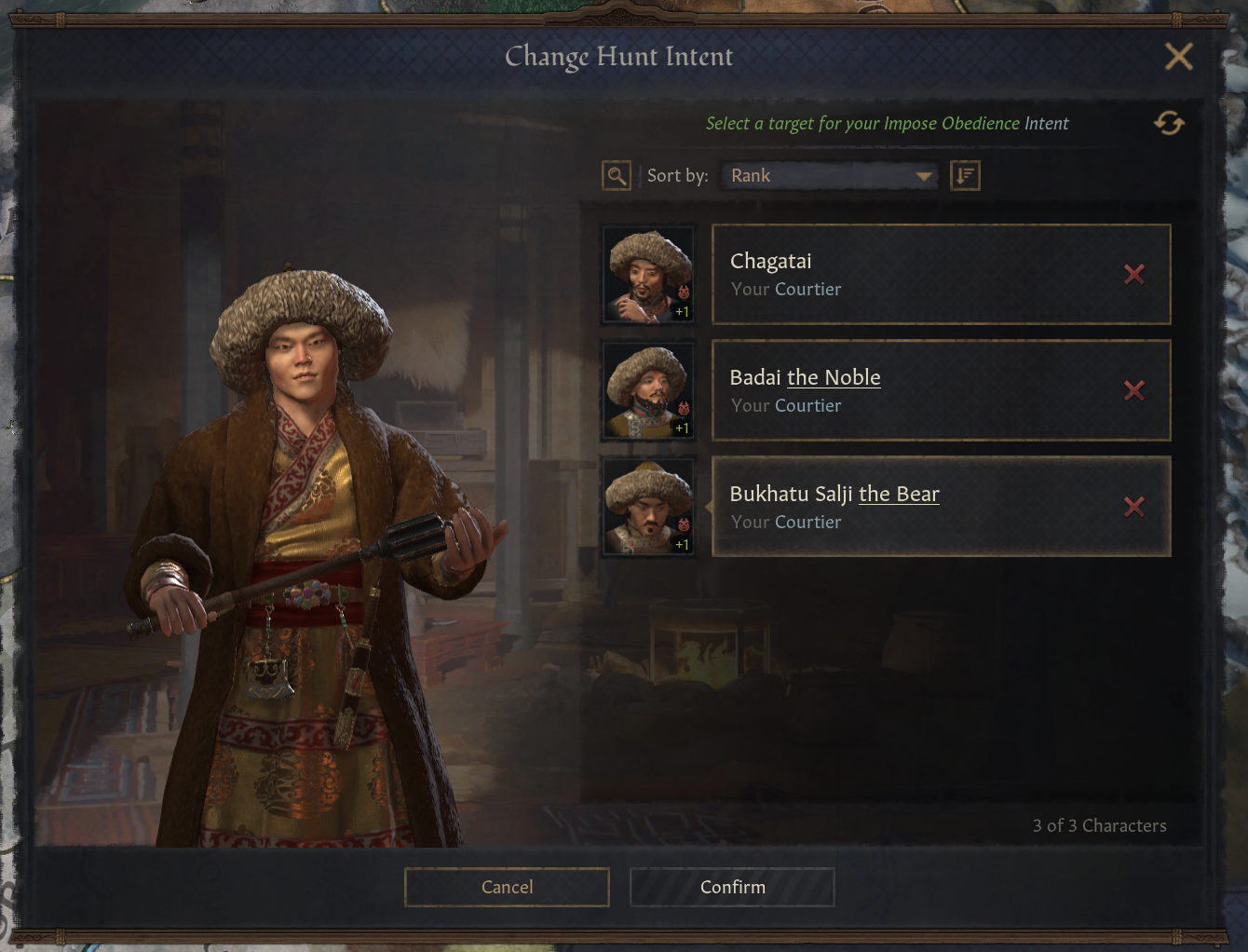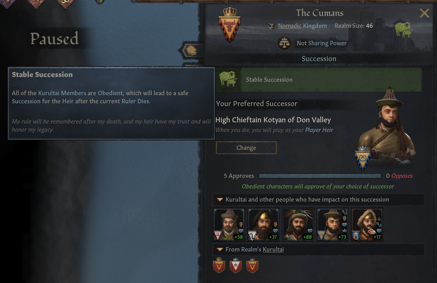Obedience is a binary state – either you are obedient or not. Every character that's a subject or courtier has Obedience towards their overlord. Obedience works as a threshold; if a character is below the threshold then they will be unruly, plotting against their overlord or just having general acceptance maluses to various interactions. However, if a character is above the threshold then they will not form factions, start hostile schemes against their liege, and – more importantly – will take their side during the Kurultai succession by voting for whichever heir was your preferred one. The Kurultai is formed by special members of your Council, and having them on your side is extremely important for Nomads.