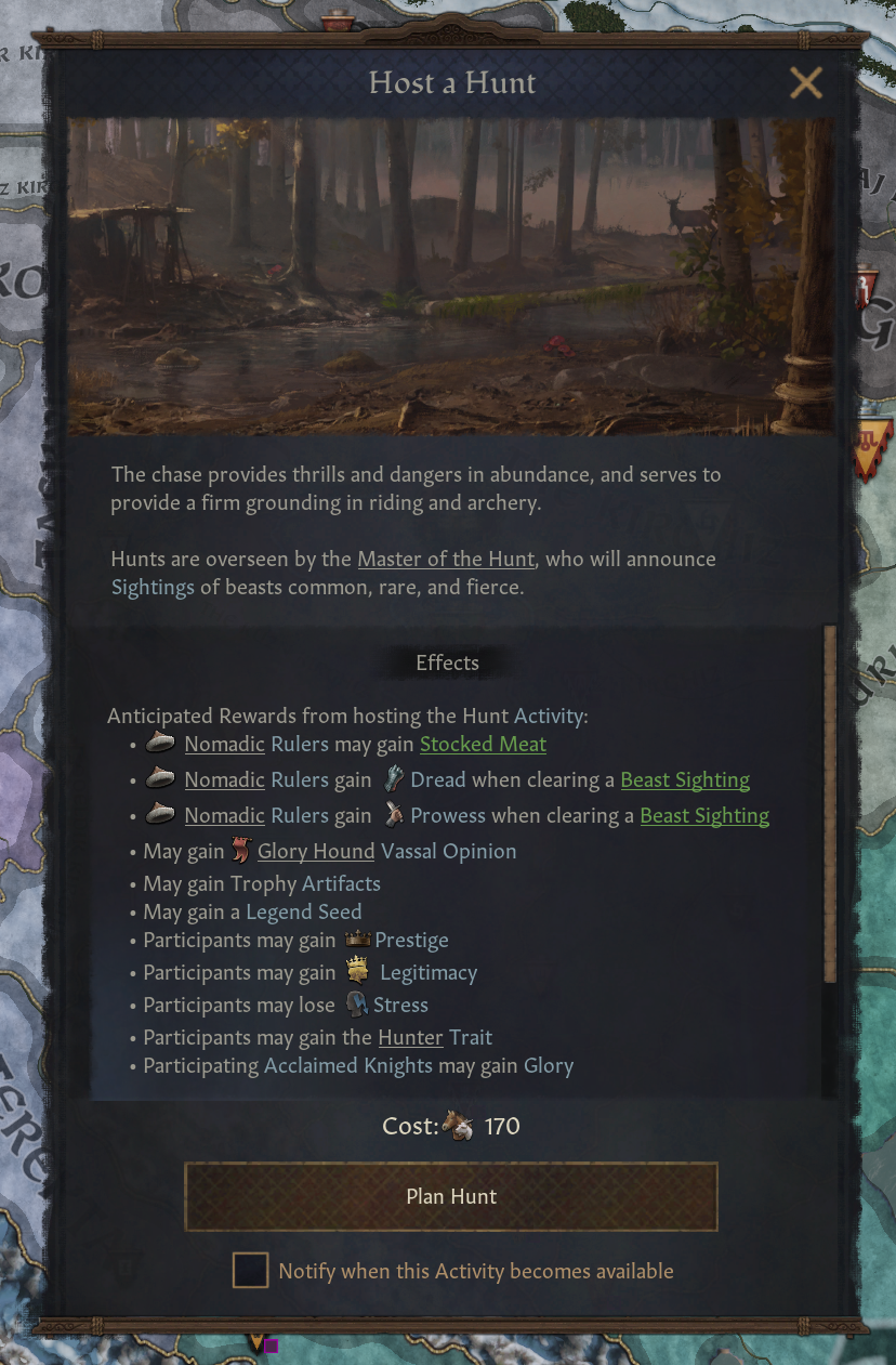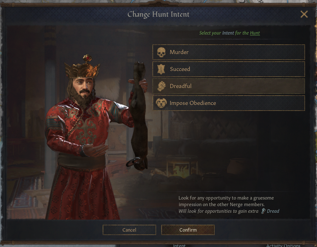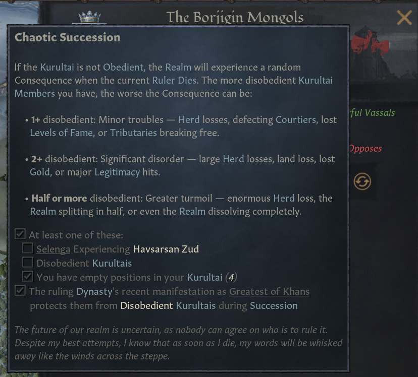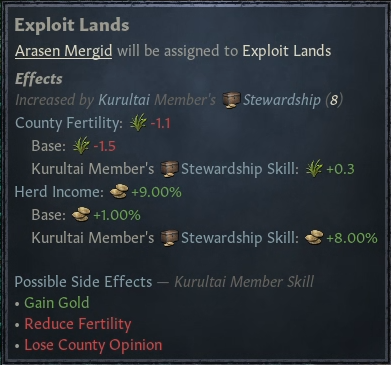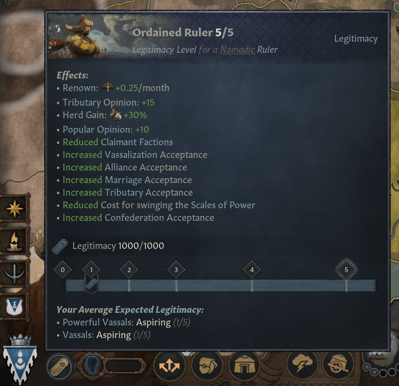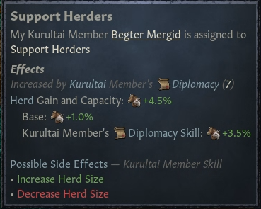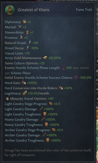 The Gurkhan is whoever has the largest Herd within the Great Steppe. They are on their way to reach the highest Dominance and are a threat to all. Confederations may form to target them, while hostile scheming and wars may target them more frequently, and the Gurkhan will have to prove that they deserve their seat.