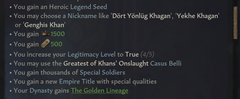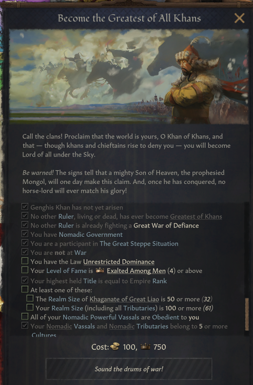 Above, you can see some additional requirements. Not only must you be the first to achieve Greatest Khanship in your playthrough, but you need an empire of substantial size and to command the Obedience of a range of powerful nomads.