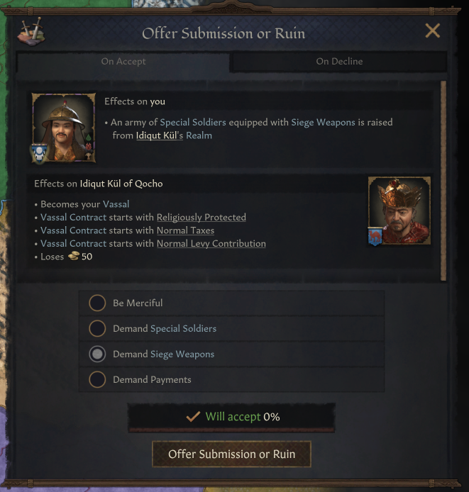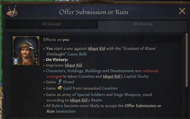 The casus belli used by Offer Submission or Ruin is also available to the Great Khan independent of the interaction, to be freely used for seizing whole realms. However, it only has its devastating refusal effects when incurred as a result of, well, being refused.