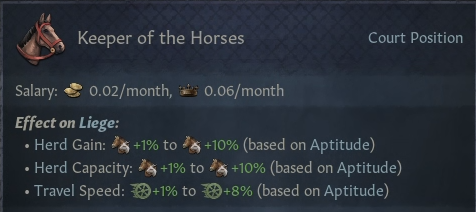The Keeper of the Horses ensures your steeds are well-equipped for war and travel. They also have access to the two tasks that Master of the Horses usually have access to.
