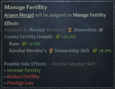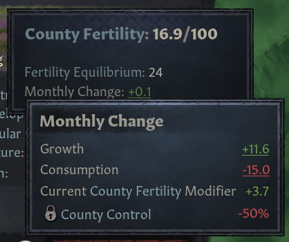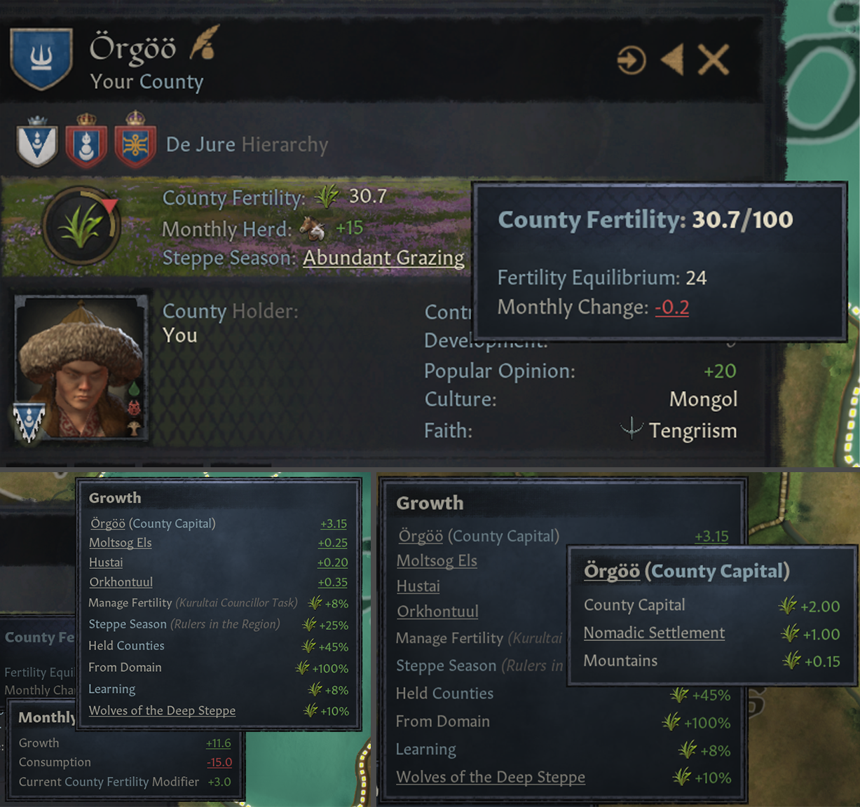 County Fertility is calculated primarily based on the terrain type. Nomads deplete Fertility of the counties they hold until it stabilises at a fixed number where the Herd can be maintained. This number is mostly affected by the domain size, but Stewardship, dynasty perks, yurt buildings and other character modifiers can affect it.