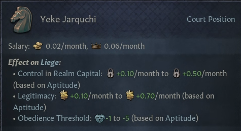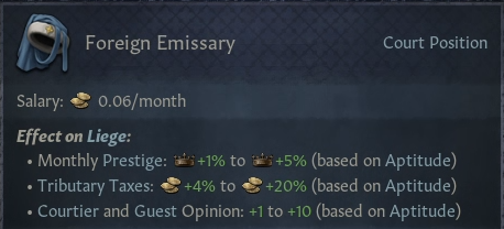 Finally, we have a position for those with many tributaries. It has access to the task ‘Entertain Courtiers’ from the Court Jester and a new task to increase culture acceptance and gain opinion with your tributary cultures.