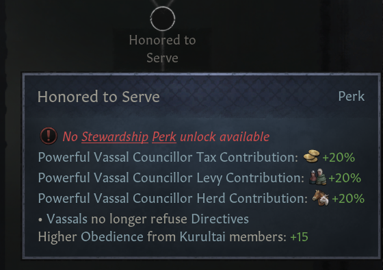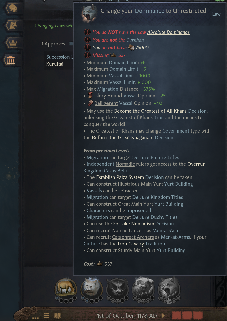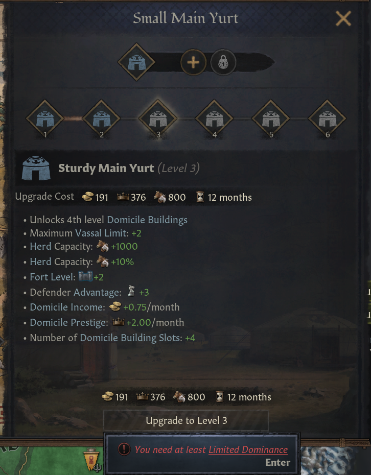 Dominance affects things such as Vassal and Domain limits, with the lower levels having a very reduced number of both, but with higher levels offering impressive bonuses. Dominance also governs the tiers that you are allowed to target during your migration (more on this in "Land"), access to special Men-at-Arms, title and vassal revocation, settlement outside of the Steppe, flavourful decisions and more.