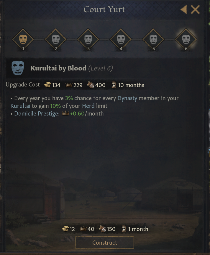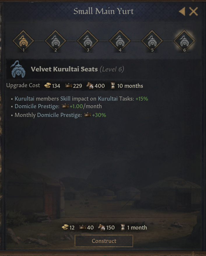 If ruling the steppe is a family business for you, since only blood guarantees loyalty, this yurt will allow you to reap additional bonuses from having your step-aunts and step-brothers in your Kurultai. If your curious about Kurultai, please continue reading, more about them below.