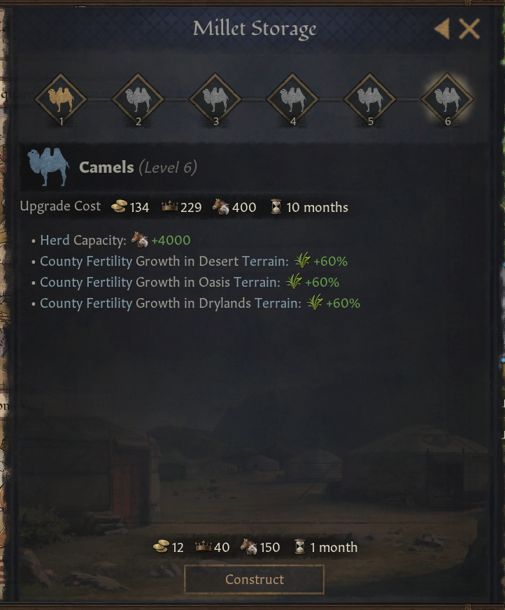 This is an upgrade to the fertility and herd-centered Millet Storage yurt. For others, the deserts are inhospitable and provide little fertility and herd, with a little bit of investment your Nomads can thrive where others perish. There are similar yurts that cover other types of terrain as well. To further specialize, some cultural traditions have received Nomadic bonuses as well, once again, more about it down below.