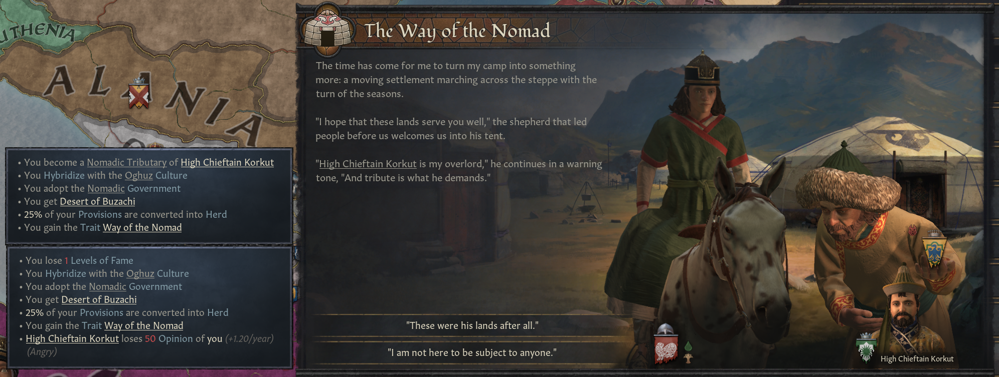 The targeted ruler will be either displaced to their other lands if they hold any titles outside of the de jure, or be made landless – similar to Administrative Noble Families or Adventurers. While landless, Nomads keep their yurts and upgrades but can't grow their Herd due to the lack of stable access to Fertility. They roam the Steppe in search of a new place to set up their tents.
