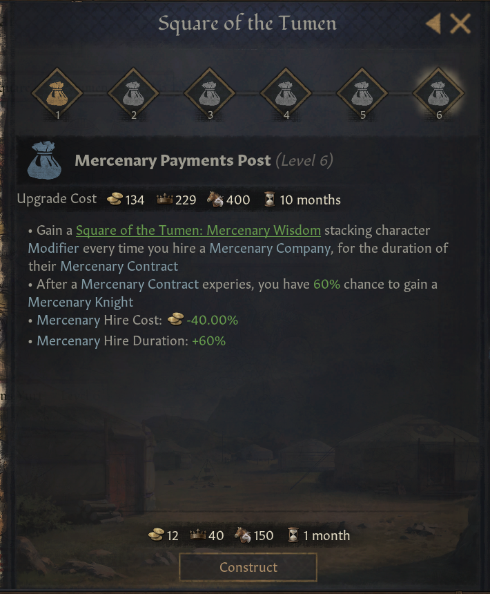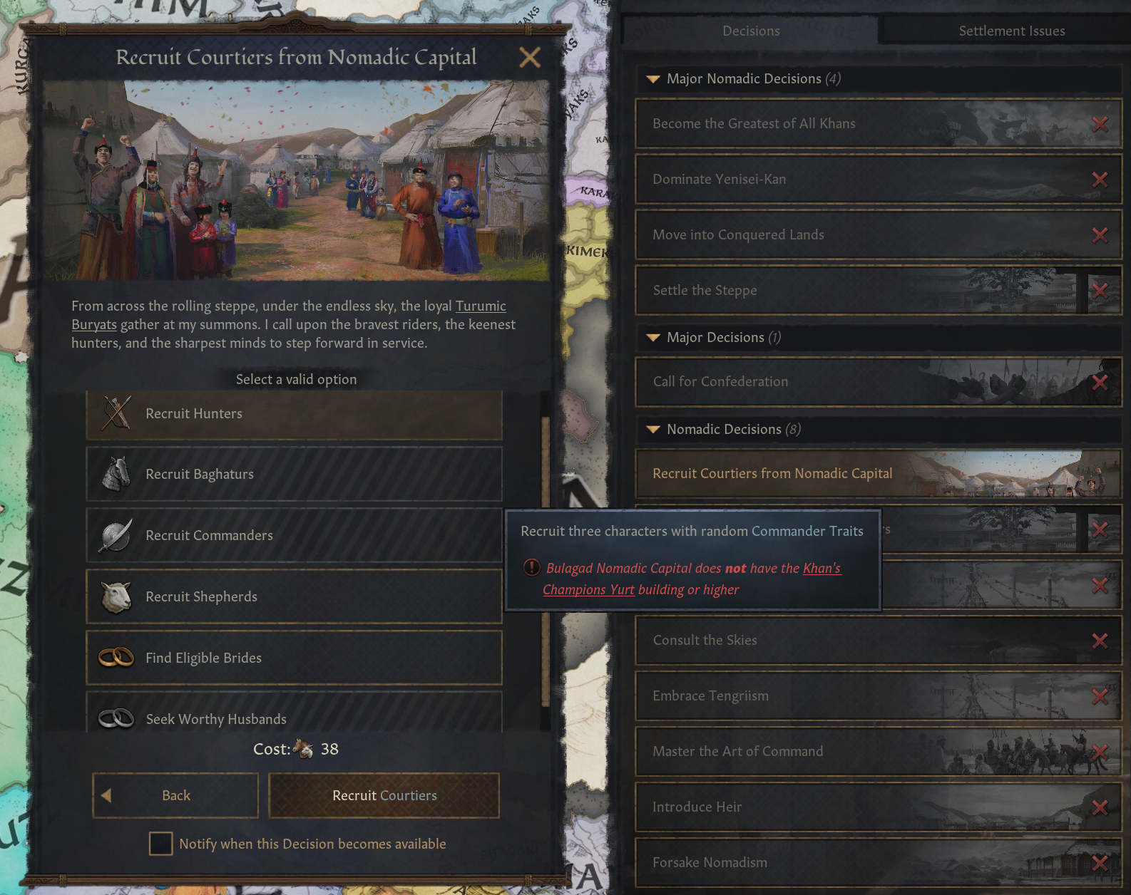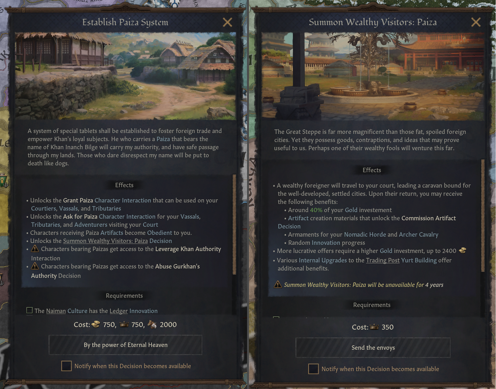Each of the yurts provides various bonuses centered around particular aspects of Nomadic life. There is one more yurt not visible in the screenshot above, the Barter Stalls, upgradable into Grand Bazaar. It can be constructed if your realm borders the settled people outside the Steppe and connects to Summon Wealthy Visitors and Establish Paiza System decisions shown in the previous dev diary.