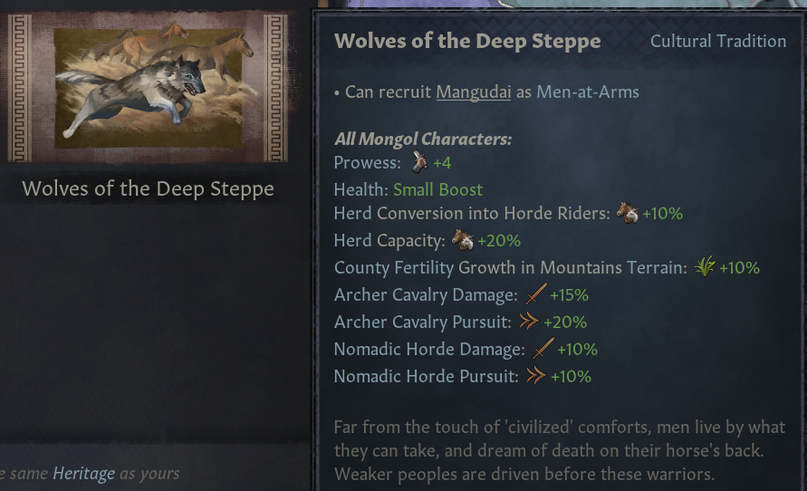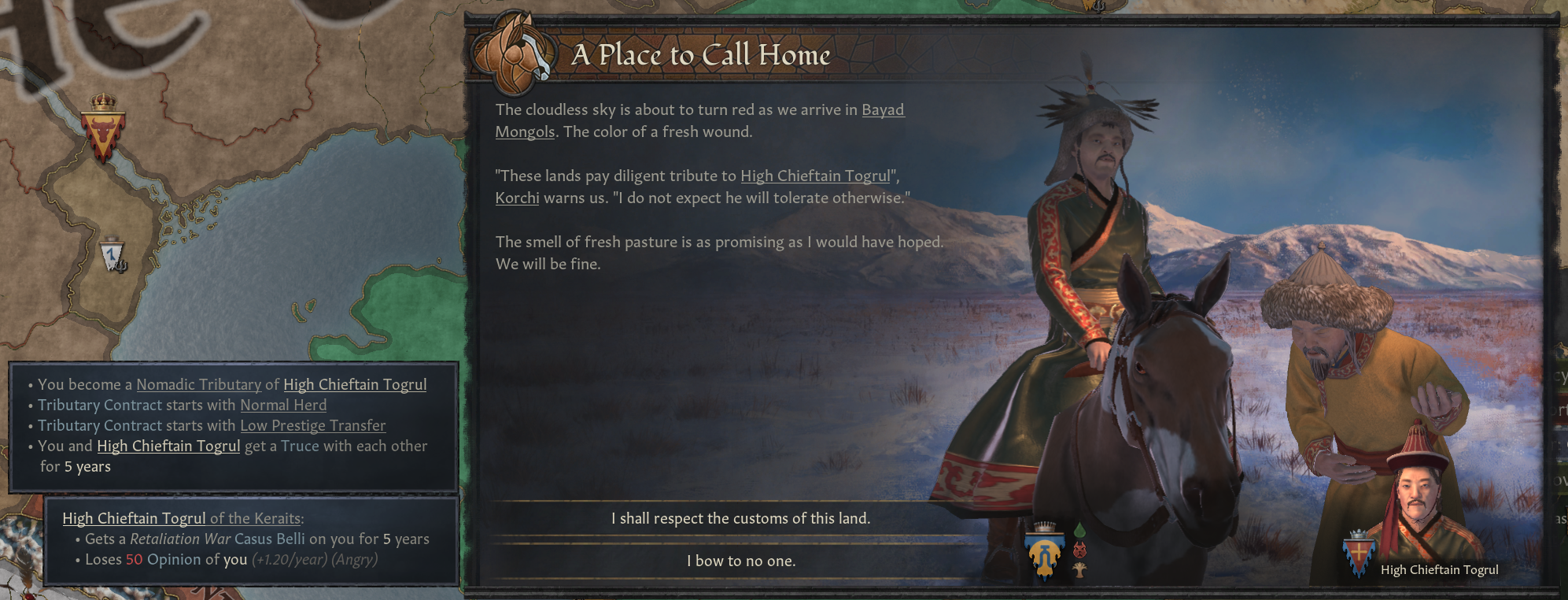 The Cultural Head gets to take the cultural name (The Mongols), while the smaller rulers have a combination of their House Name + Culture (The Borjigin Mongols). To better reflect the dynamics of the Steppe, we have also changed the way that the Cultural Head is selected in Nomadic governments: the ruler with the biggest Herd becomes the Head instead, independently of their title.