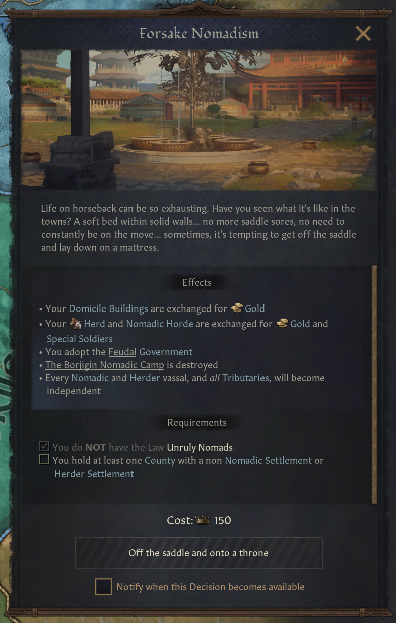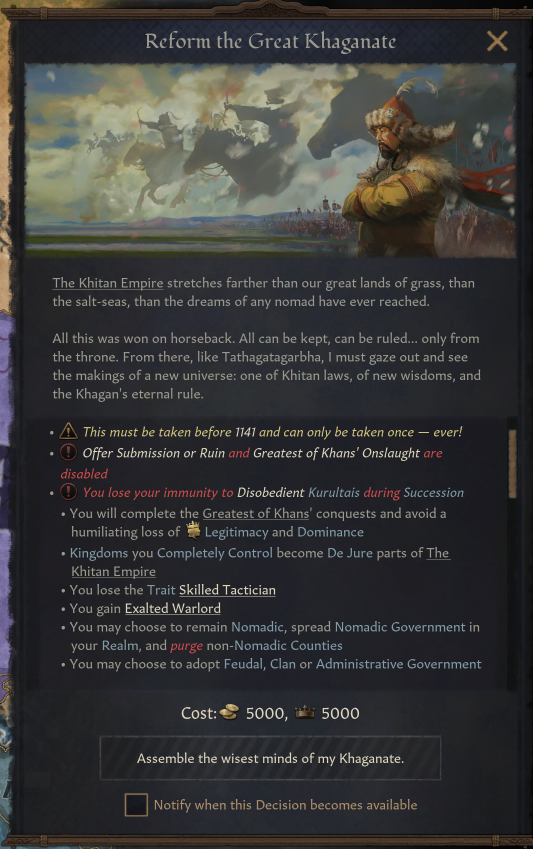The Greatest of Khans will lose these special capacities if they do not take the Reform the Great in time. It’s a possible end goal for them, and is it ever an endgame one, my dudes. It will afford you with new de jure lands and a major choice: establish an admin/feudal/clan empire OR RAZE CIVILIZATION TO THE GROUND AND LET NOMADISM REIGN.