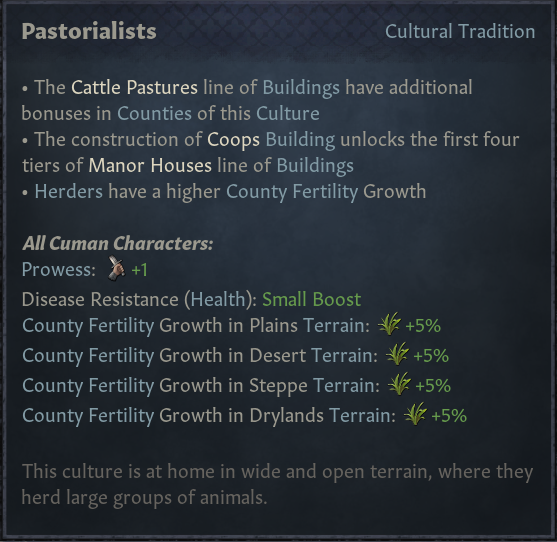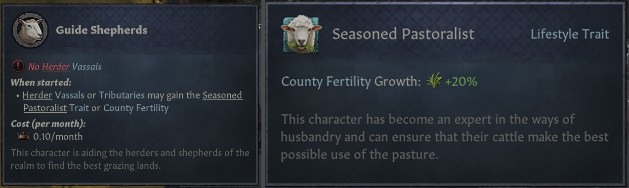 Nomads are not the only rulers that inhabit the Steppe. A new unplayable government type called "Herder" populates the map with shepherds that wander small counties. Herders replenish Fertility over time, and are extremely easy to displace, given their lack of armies. They are the ones occupying those counties left behind by migrations.
