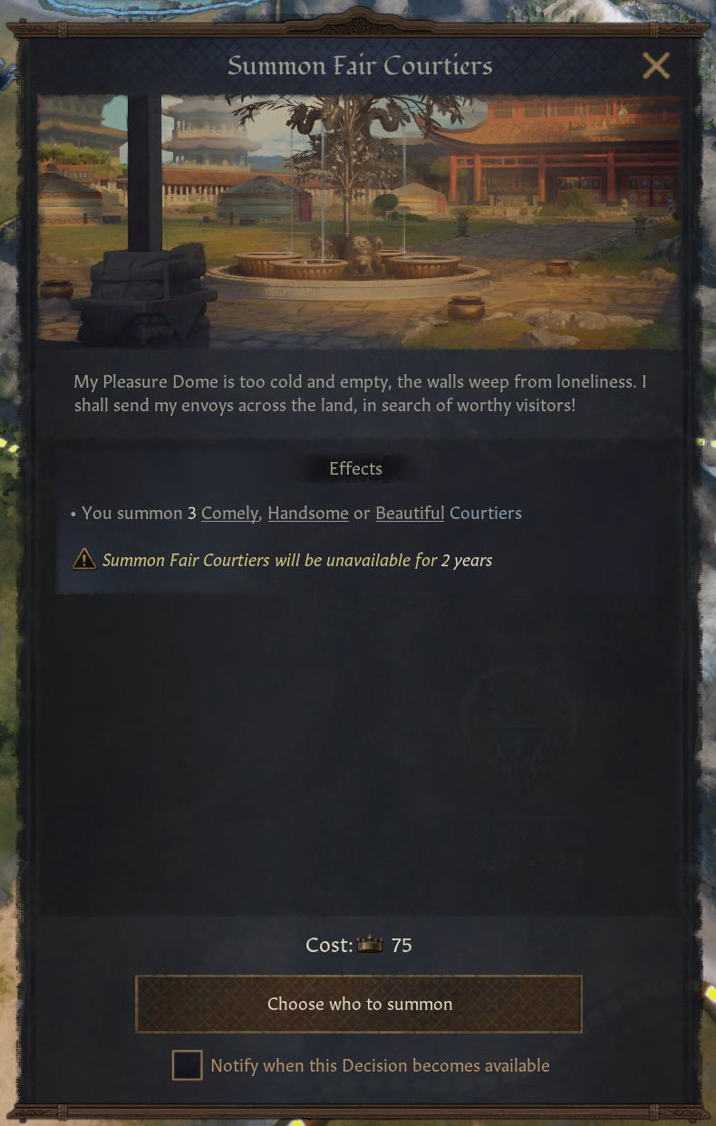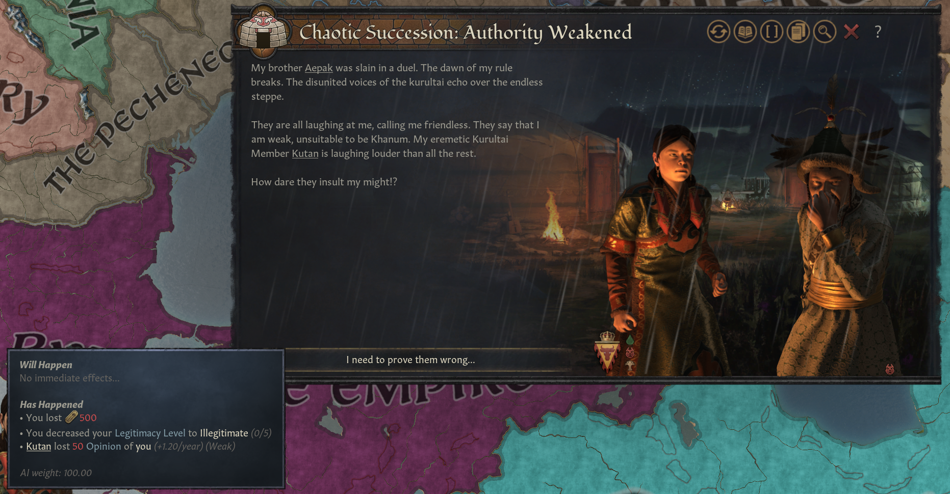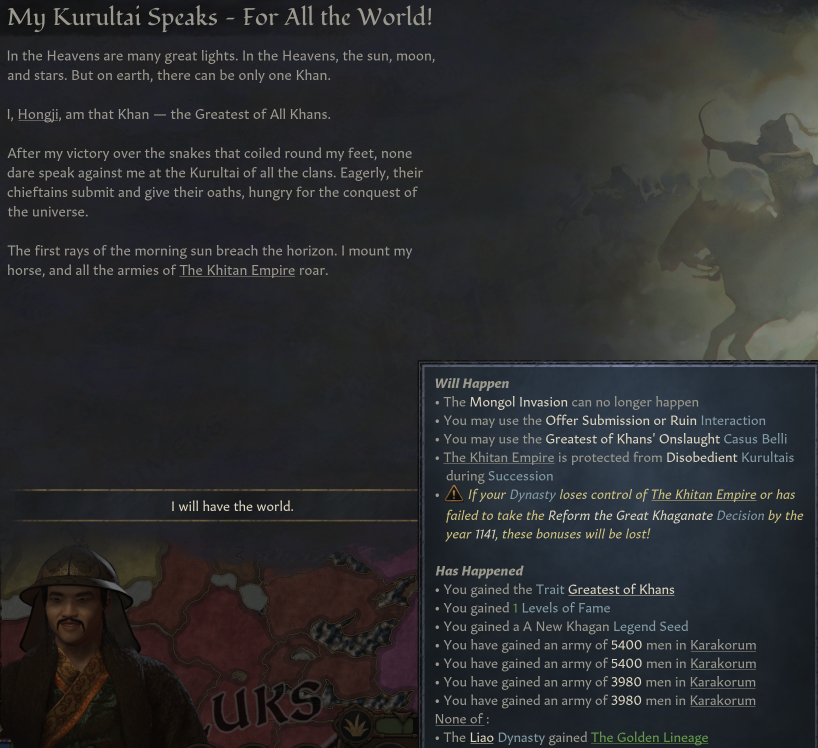 And there it is. You - or your fearsome foe - get the Greatest of Khans trait, a slew of big ol’ nomadic armies, and the mission to conquer a big chunk of the world and establish your lasting reign within 75 years. This is done through the Reform the Great Khanate decision.