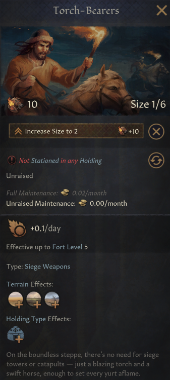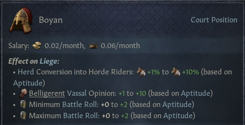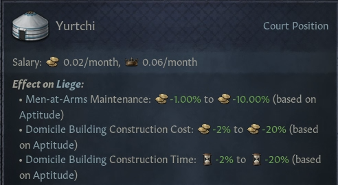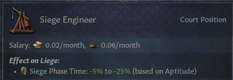 The siege engineer is instrumental if you want to start sieging areas outside the Steppes. It has access to the task to increase fort level in your lands, but also a new task that gives a chance to get access to Siege Weapon MAAs (which is usually harder for Nomads to get access to). This position can only be held by someone with the Military Engineer trait, so you will likely have to look outside the Steppes to find a fitting candidate.