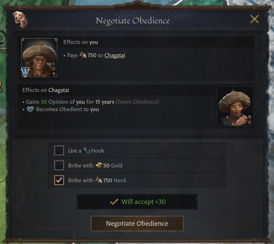 Negotiate Obedience is a character interaction that can be used to bribe someone with Herd or Gold.