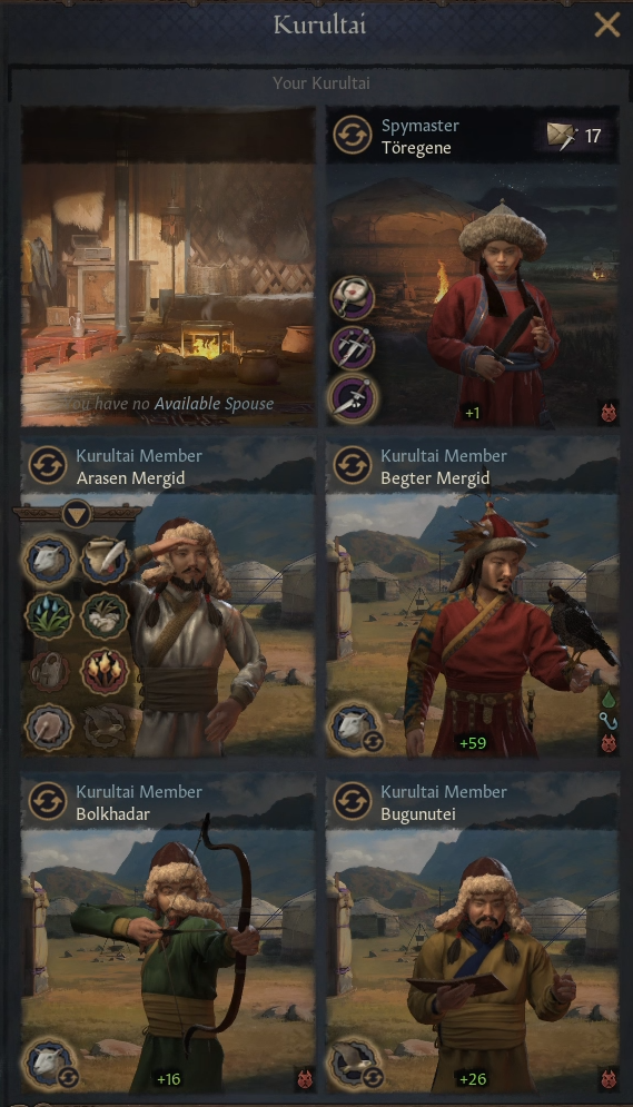 Nomadic rulers no longer have access to the regular Council but instead have a unique Kurultai setup for its council. They keep the Spymaster, but the rest of the positions have been replaced with a new Kurultai position.