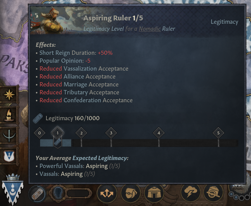 Nomadic rulers have access to Dominance, a measurement of their perceived power. Low Dominance implies a relatively insignificant chieftain, while the maximum Dominance represents the rise of Genghis Khan.