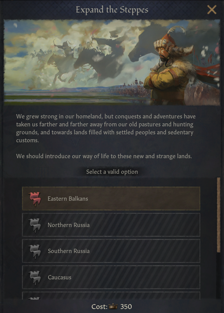This means that smaller rulers should migrate frequently, either find abandoned lands occupied by Herders, or subjugate themselves before bigger rulers. Bigger rulers in the Steppe should, on the other hand, adopt a more sedentary way of life and demand Obedience and Tribute from rulers in their sphere.