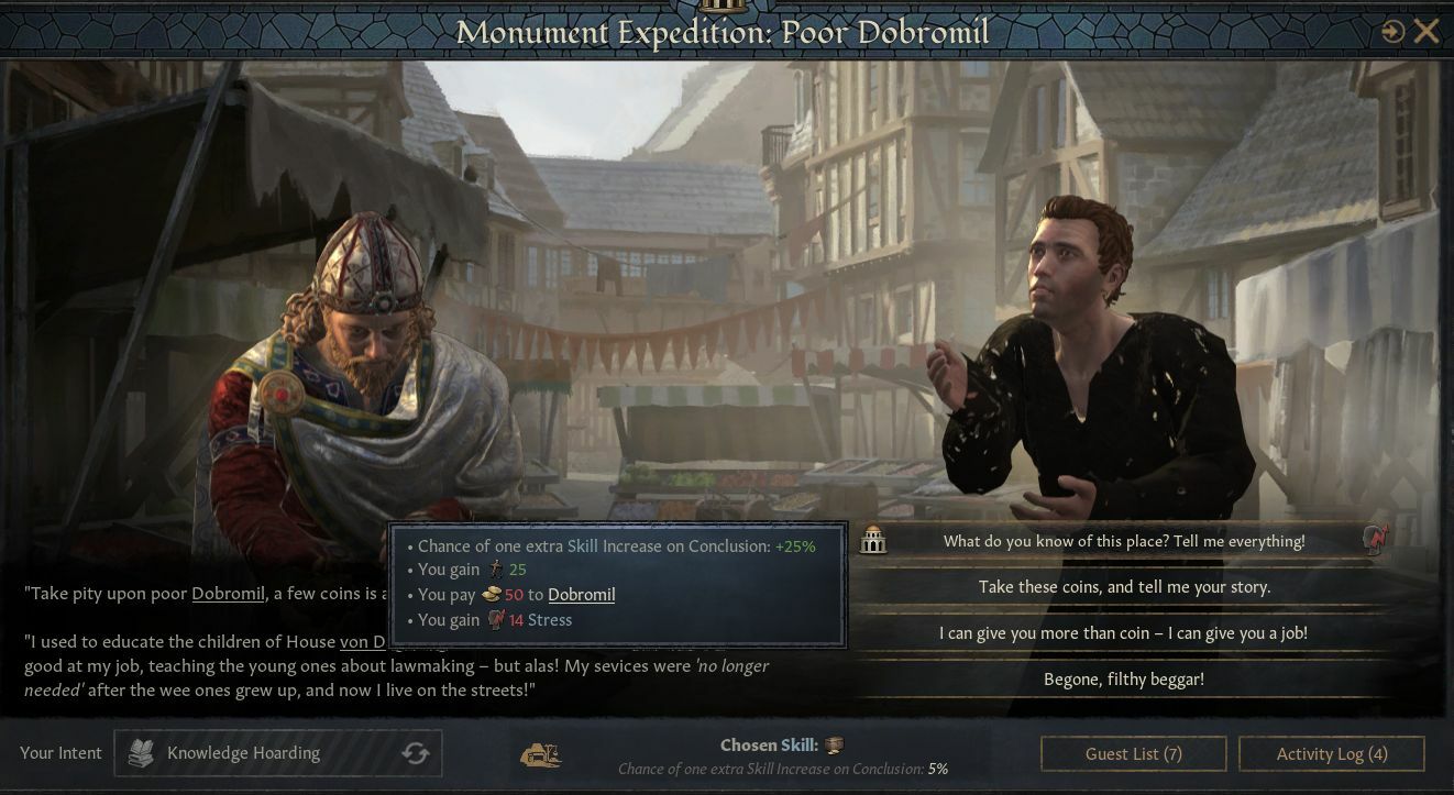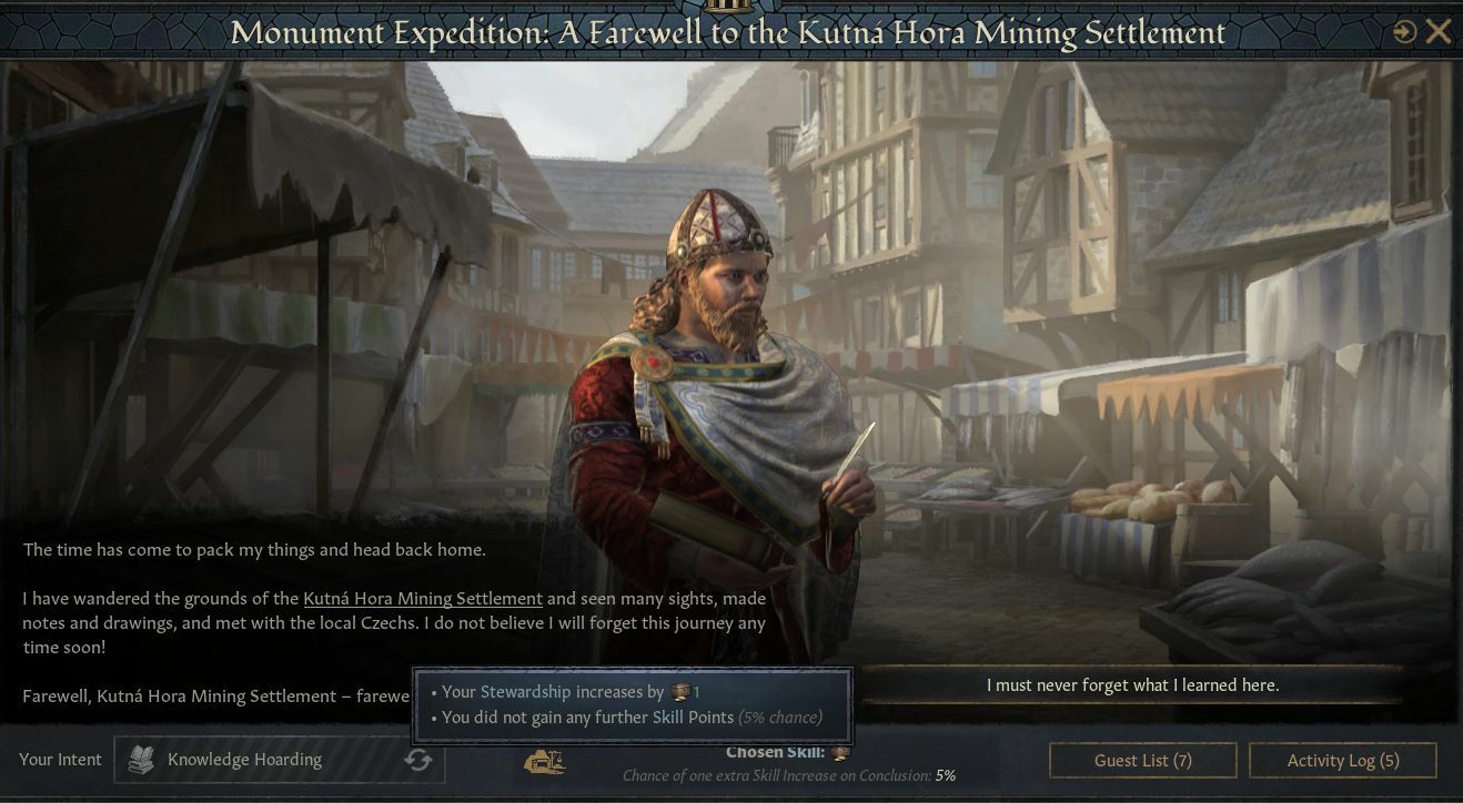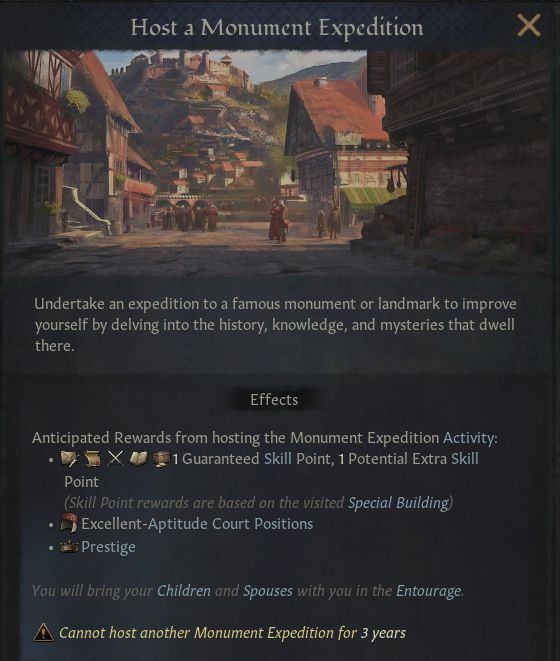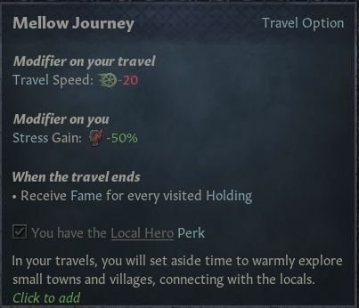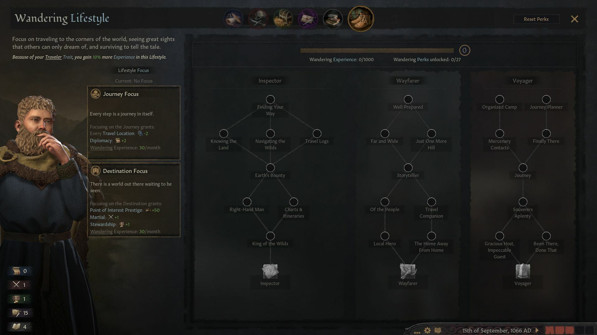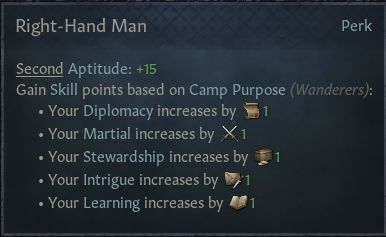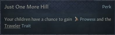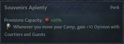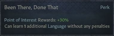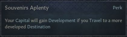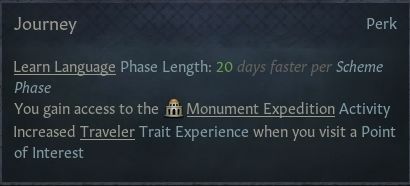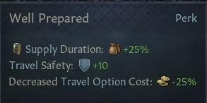 This is the other perk I mentioned in the ‘Finally There’ perk. It increases almost all rewards you gain from Points of Interest by 30% (with a few exceptions, like events triggering or gaining traits). This is the absolute capstone perk of the tree, and it enables a playstyle mostly traveling around and seeing Points of Interest with Monument Expeditions and Pilgrimages while still racking up lifestyle experience points, a lot of prestige, and reducing stress.