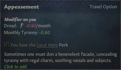 When we originally made the perk for landed gameplay, being able to handle your regent at home would help someone who would regularly travel abroad to see things. If the idea was that you should be able to travel to distant places, we didn’t want you to get punished too hard immediately.