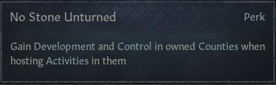 As part of our work on this lifestyle tree, we wanted to give the player more active tools for gaining control and development, of which this perk is a key part. By hosting feasts, hunts, inspections, or other activities, you can now focus on where you want to improve something.