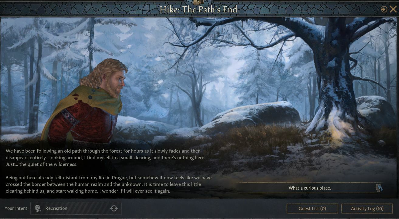 This unlocks a new decision: You can write a book about your travels somewhere. This is a leftover from when the tree was focused more on surveying the land rather than inspecting it when we focused more on mapping out your realm, etc. We like how the decision turned out, so we kept it as is, even if things around it have changed slightly.