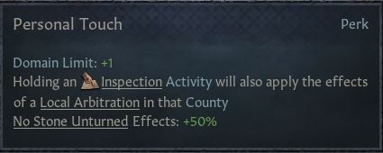 This is the proper capstone perk of this tree, binding together ‘No Stone Unturned,’ ‘Inspection,’ and ‘Arbitration’ in one, either giving you them for free or improving them. This should be a noticeable boon for those who want to simply do realm gardening and ensure their little realm runs smoothly.