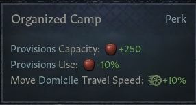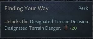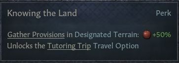 However, this didn’t quite work when we looked at the tree for landless characters, as… Well… They could reach a destination every other day if they kept moving their camp about. Instead, we attached the same idea directly to Points of Interest, which synergizes surprisingly well with another perk further down the tree. We initially kept the original idea for landed gameplay, but after seeing the synergy and how much cleaner it looked, we changed it to be the same as the landless one.