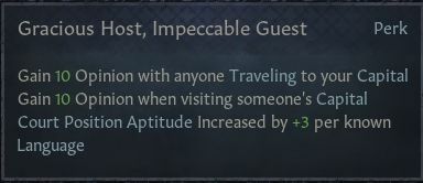 This is the primary payoff perk for the language theme, as you get a neat bonus for all your court positions. It’s not grand or super impactful, but it can add up if you have a lot of active court positions.