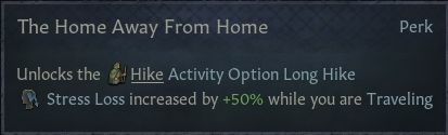 This is the capstone perk for stress loss. You can increase your stress while traveling and open up a new activity option: expanding the time spent on a hike. This should give you more options to lose stress or gain fame.