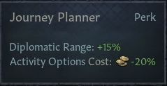 Looking into opportunities to go to distant locations, we figured a boon to diplomatic range would be an exciting option. One thing to note is that it is not an easily obtainable modifier in many places in the game, giving another reason for dipping into the tree. Another thing to note is that the tree unlocks diplomatic range matters for the Monument Expedition activity, so increasing it slightly means you will have access to more locations for that activity if you so wish.