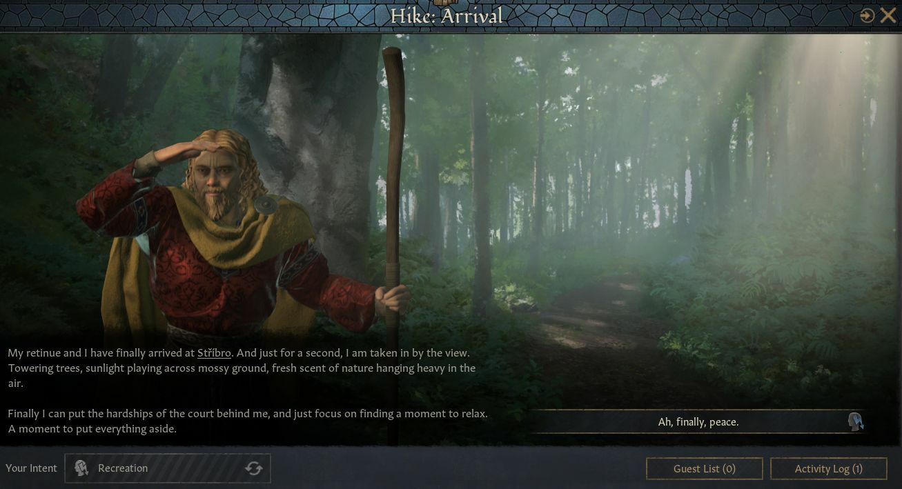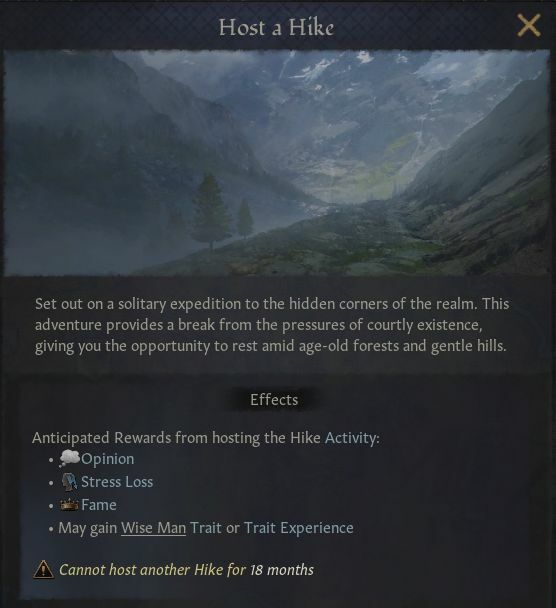 The first capstone perk of the tree enables both the fame and the stress loss synergy. It gives you fame from hikes and random travel events (particularly danger-related ones), and the activity is intended to be a very effective way of removing Stress (similar to feasts).