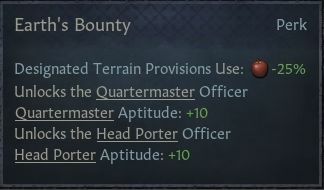 Replacing the Inspection trait wasn’t easy, as it was vital to the original tree. What we looked at was to continue the logic from the ‘Knowing the Land’ perk, where provisions are less of a problem as you travel through your Designated Terrain. Opening up the Quartermaster and Head Porter positions irrelevant to your buildings means you will always have effective ways of handling provisions.